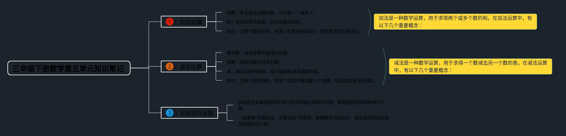 小学三年级下册第五单元思维导图合集,小学三年级下册数学思维导图第五单元,内容涵盖目录、基本概念、加法和减法、乘法和除法等4个要点,22张可打印,每张思维导图都非常清晰,每张图片均可打印。