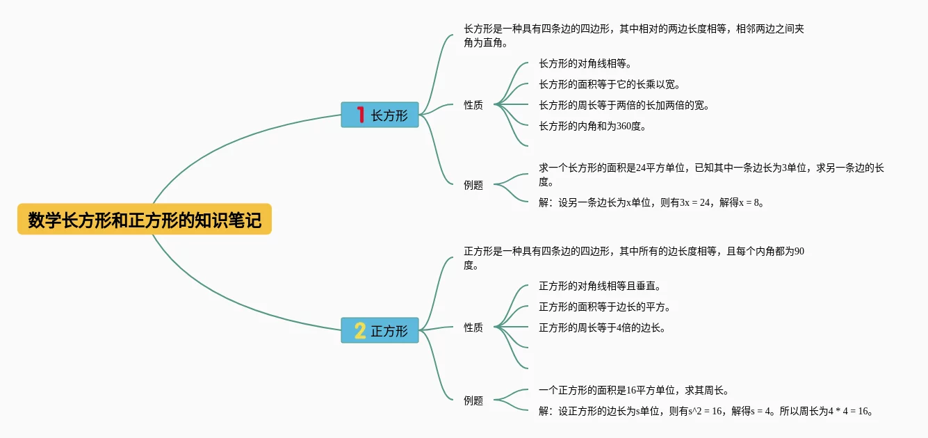 24张数学长方形和正方形的思维导图汇总,数学长方形和正方形的思维导图,内容涵盖特征、计算方法、重点等3个方面,24张高清晰可打印,每张思维导图都非常简单,每张图片均高清晰可打印。