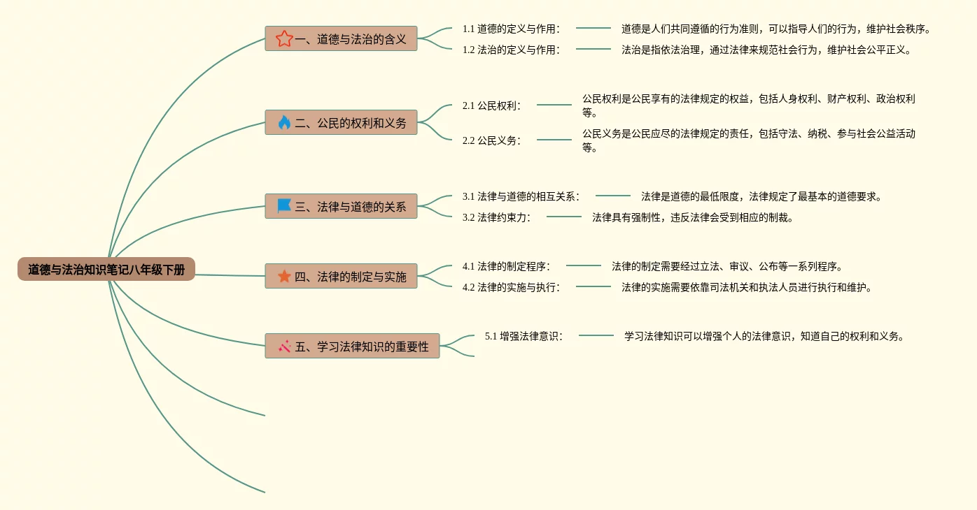 20张道德与法治思维导图八年级下册合集,道德与法治思维导图八年级下册,内容涵盖道德与法治的含义、公民的权利和义务、法律与道德的关系、法律的制定与实施、学习法律知识的重要性等7个知识点,20张高清晰可打印,每张思维导图都非常简单,每张图片均高清晰可打印。