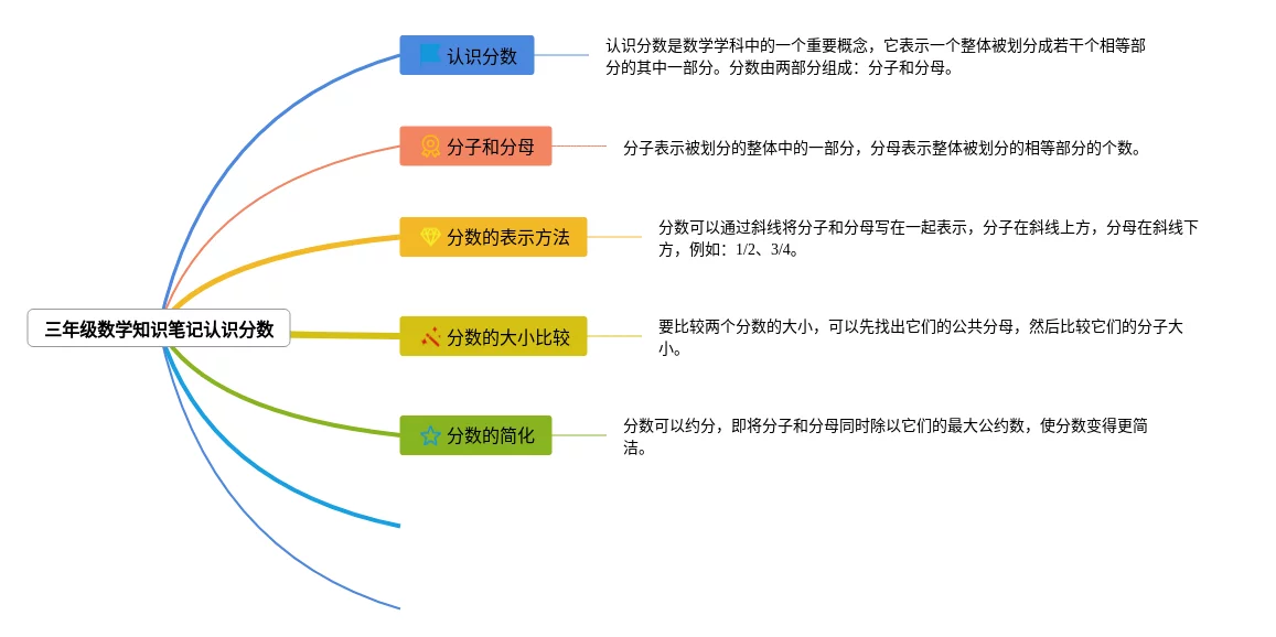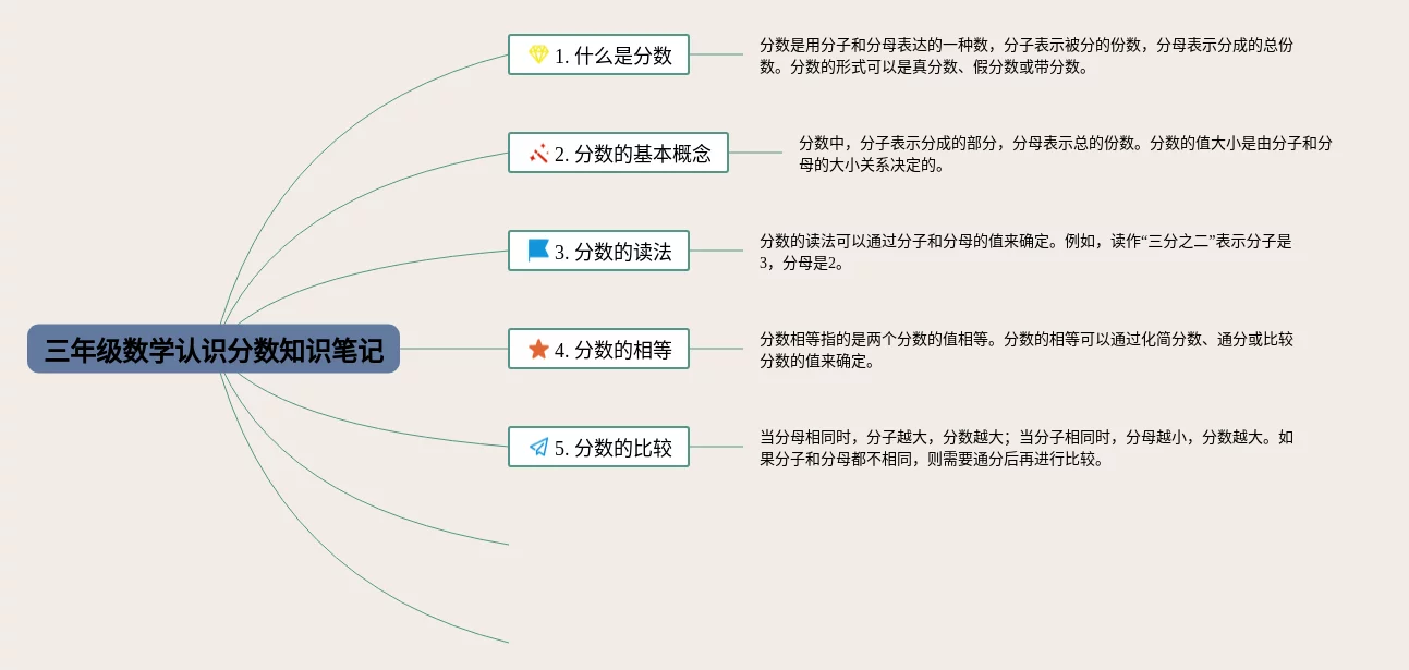 22张三年级数学认识分数思维导图合集,三年级数学认识分数思维导图,内容涵盖1. 分数的基本概念、2. 分数的读法和表示方法、3. 分数的大小比较、4. 分数的相等关系、5. 分数的简化和扩展等7个知识点,22张高清版,每张思维导图都非常漂亮,每张图片均高清版。