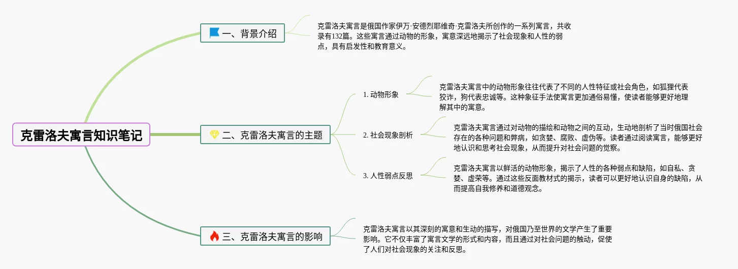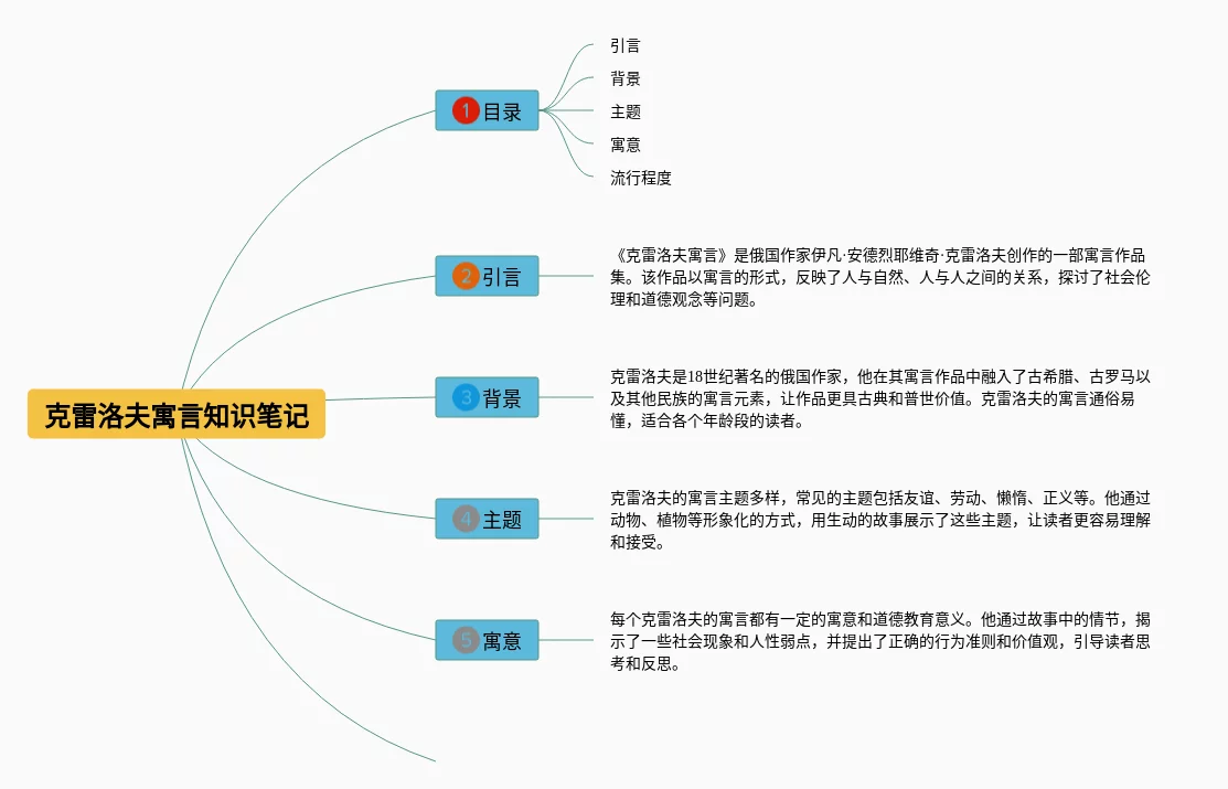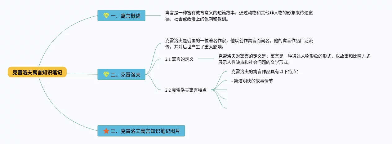 22张雷洛夫寓言思维导图合集,雷洛夫寓言思维导图,内容涵盖寓言的定义、克雷洛夫简介、克雷洛夫寓言的特点、典型寓言作品等4个知识点,22张可打印,每张思维导图都非常漂亮,每张图片均可打印。