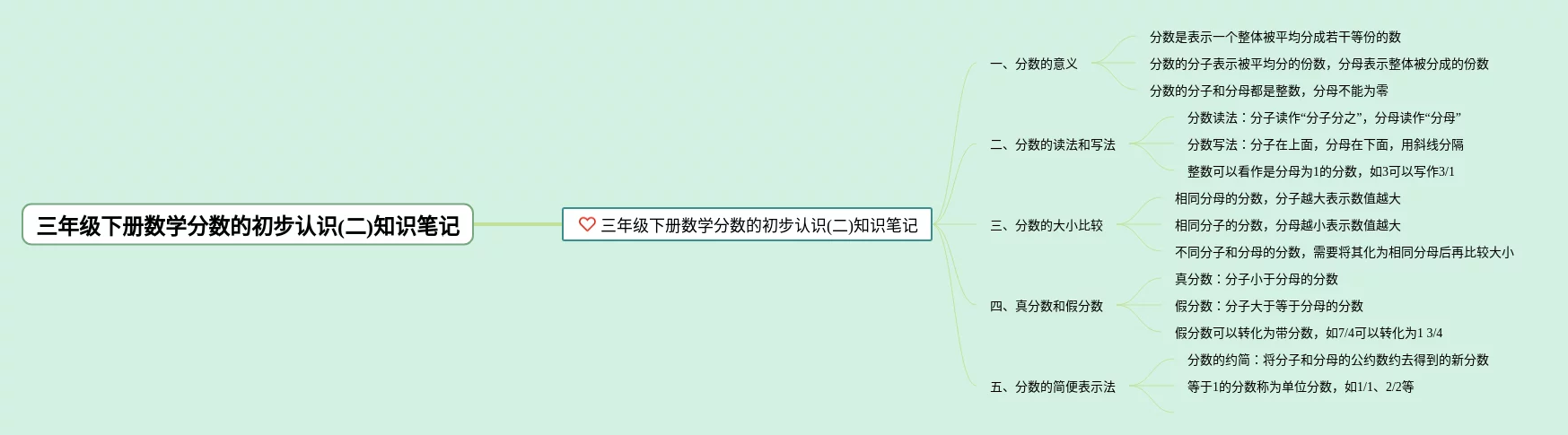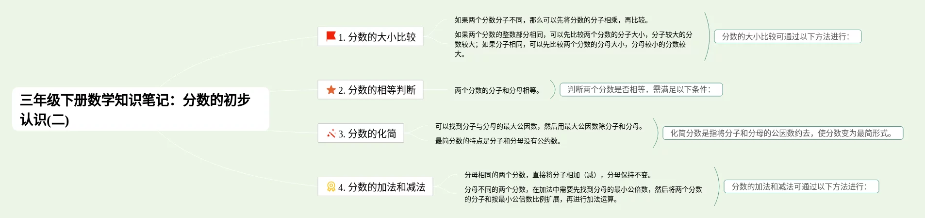 20张三年级下册数学思维导图分数的初步认识(二)合集,三年级下册数学思维导图分数的初步认识,内容涵盖1. 分数的大小比较、2. 分数的相等、3. 分数的简化、4. 分数的加法、5. 分数的减法等5个部分,二20张可下载,每张思维导图都非常漂亮,每张图片均可下载。