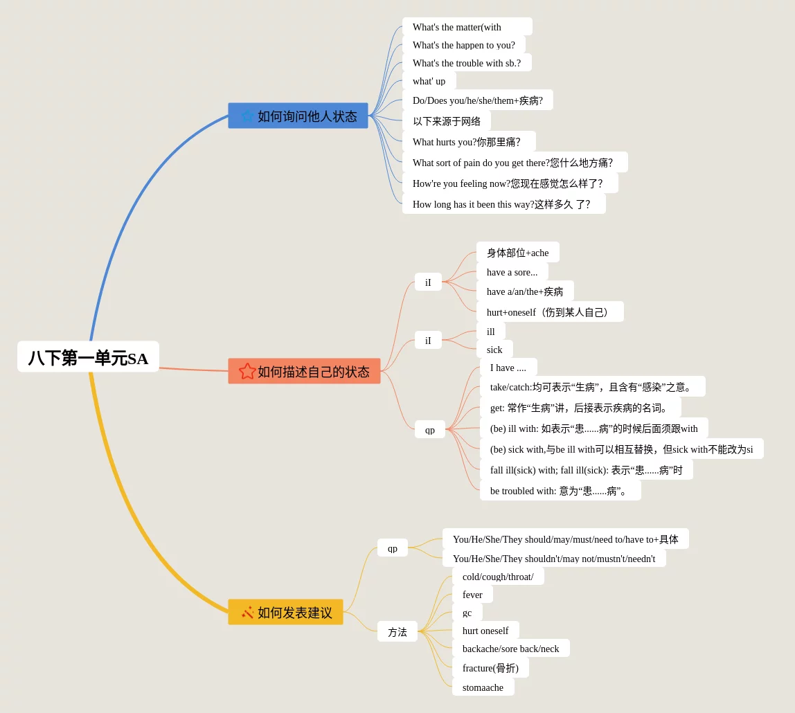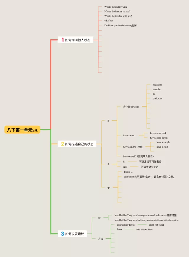 八下第一单元思维导图合集,英语八下第一单元思维导图,内容涵盖疑问、表患病、发烧、休息、某事需要做等13个要点,21张高清版,每张思维导图都非常简单,每张图片均高清版。
