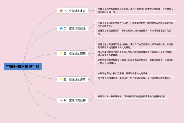 25张空城计思维导图简单又漂亮汇总,空城计思维导图简单又漂亮,内容涵盖1. 空城计概述、2. 空城计的原理与作用、3. 空城计的使用条件、4. 空城计的实施步骤、5. 空城计的成功与失败案例等5个要点,25张可打印,每张思维导图都非常清晰,每张图片均可打印。