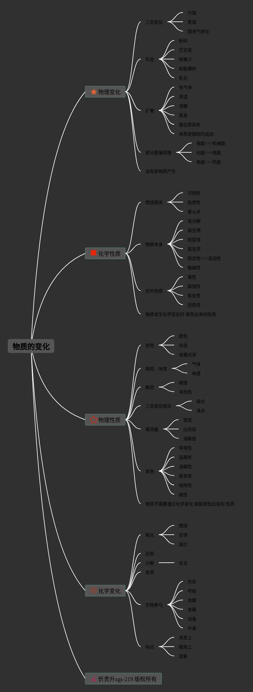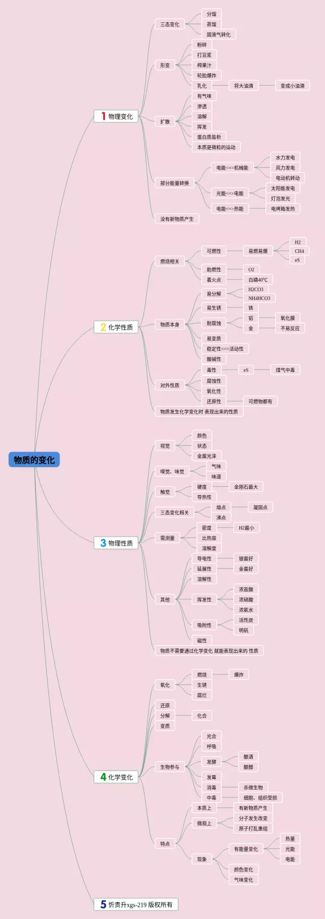 25张物质变化的思维导图合集,物质变化的思维导图,内容涵盖物理变化、化学性质、物理性质、化学变化、忻贵升xgs-219版权所有等5个部分,25张精选版,每张思维导图都非常简单,每张图片均精选版。