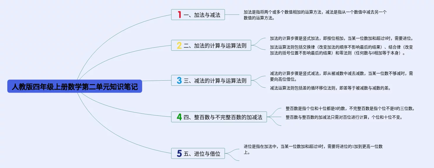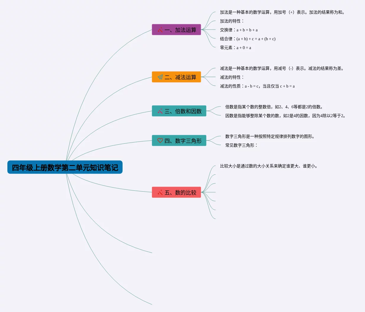 四年级上册第二单元思维导图合集,四年级上册数学第二单元思维导图,内容涵盖01.认识更大的数、02.线与角、03.乘法、04. 运算律、05. 方向与位置等8个知识点,20张可打印,每张思维导图都非常漂亮,每张图片均可打印。