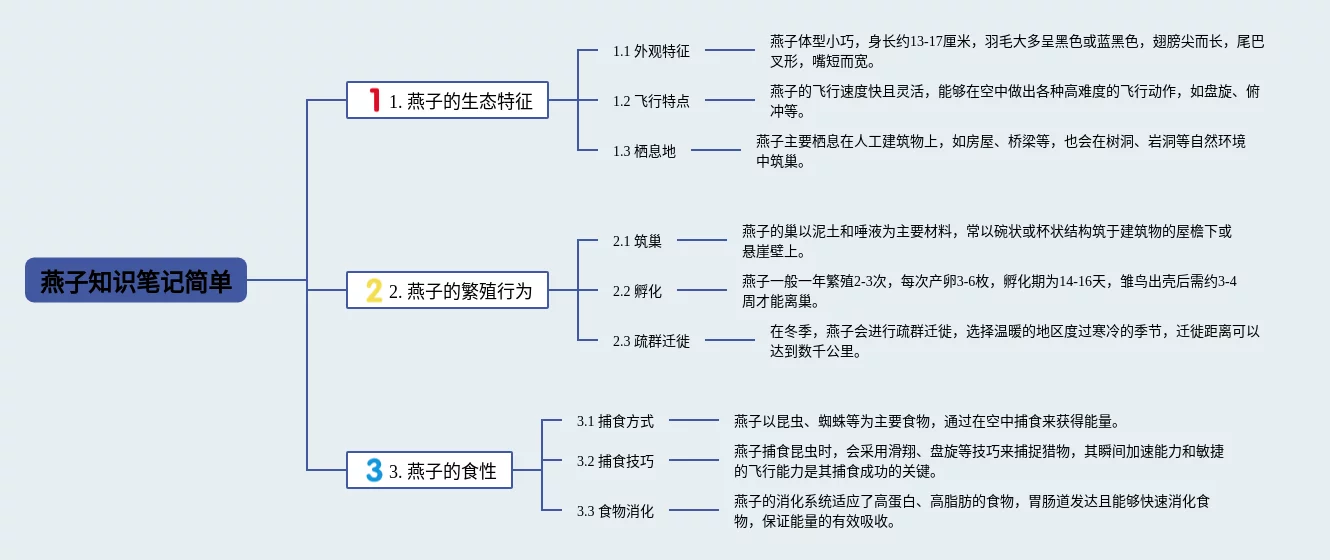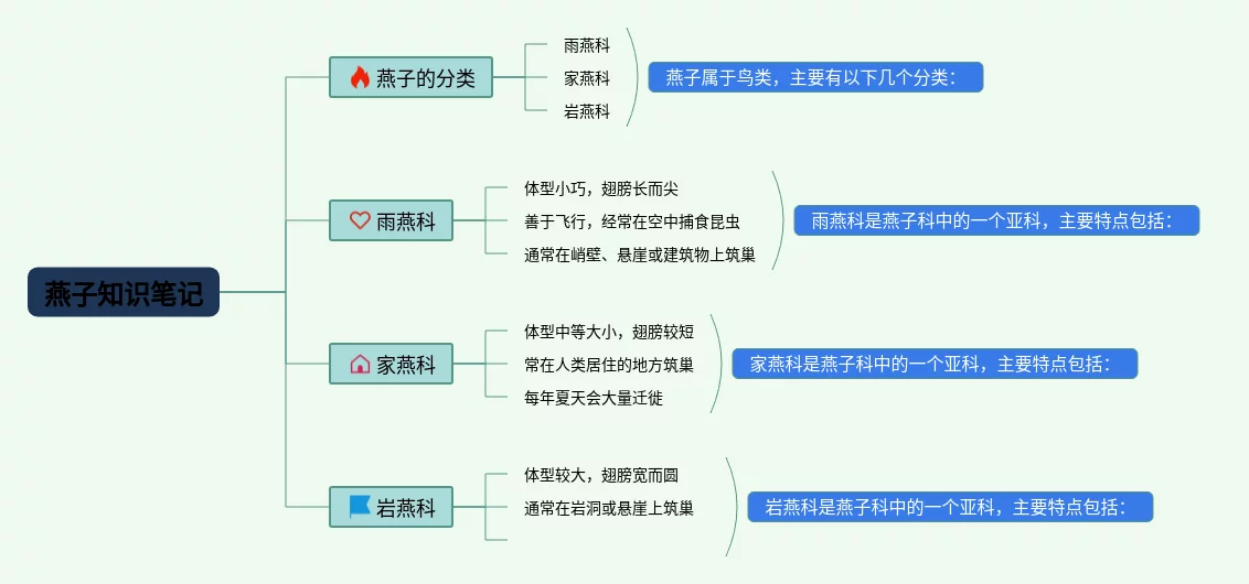 25张三年级下册燕子思维导图简单汇总,三年级下册燕子思维导图简单,内容涵盖燕子的分类、雨燕科、家燕科、岩燕科等4个知识点,25张高清晰可打印,每张思维导图都非常简单,每张图片均高清晰可打印。