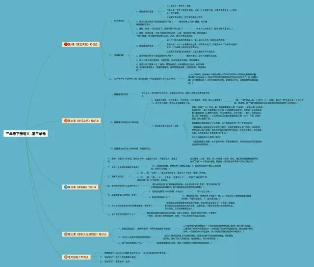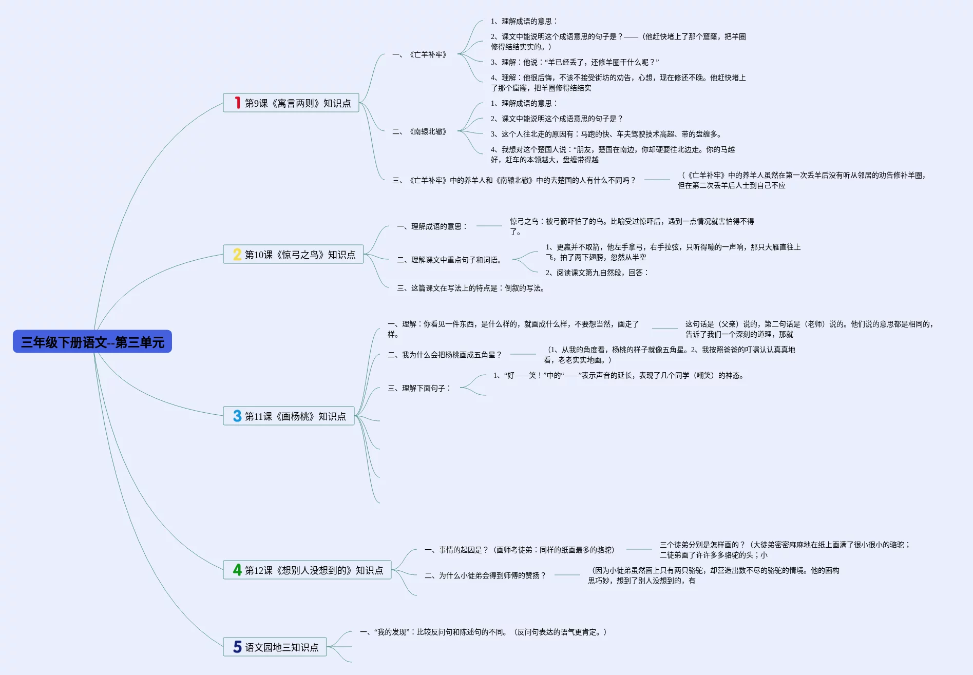 21张三年级下册单元知识点思维导图汇总,三年级下册单元知识点思维导图,内容涵盖第9课《寓言两则》知识点、第10课《惊弓之鸟》知识点、第11课《画杨桃》知识点、第12课《想别人没想到的》知识点、语文园地三知识点等5个部分,21张高清版,每张思维导图都非常简单,每张图片均高清版。