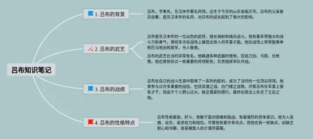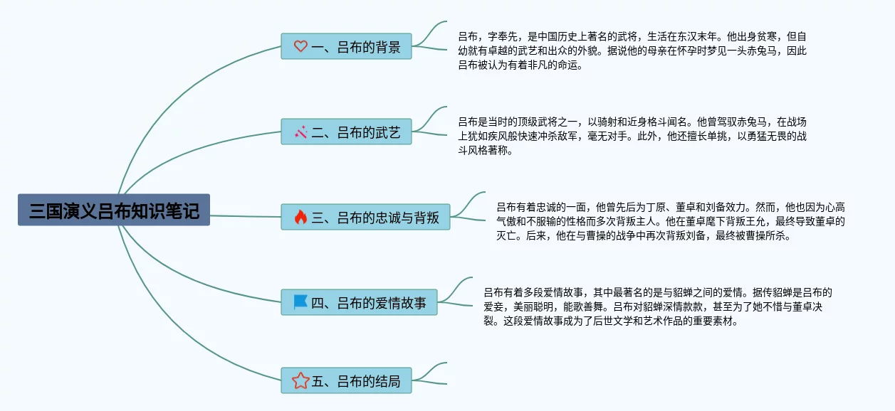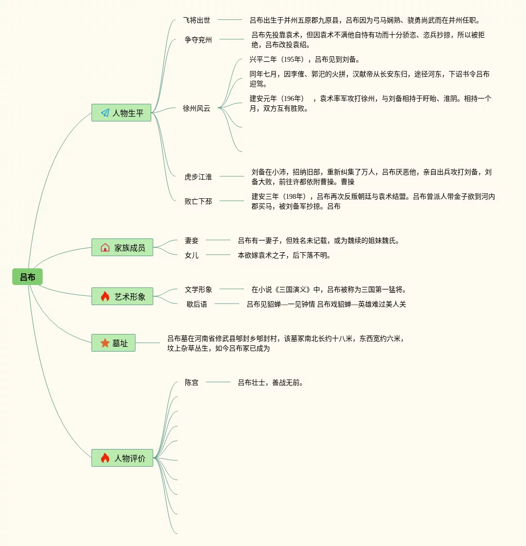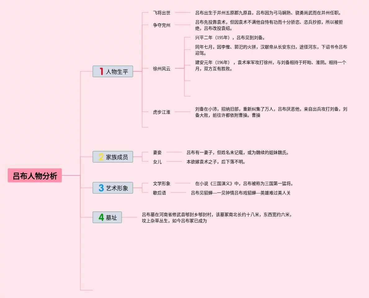 23张吕布的思维导图合集,吕布的思维导图,内容涵盖1. 吕布的背景、2. 吕布的武艺、3. 吕布的战绩、4. 吕布的性格特点等4个部分,23张高清晰可打印,每张思维导图都非常漂亮,每张图片均高清晰可打印。