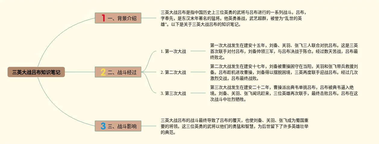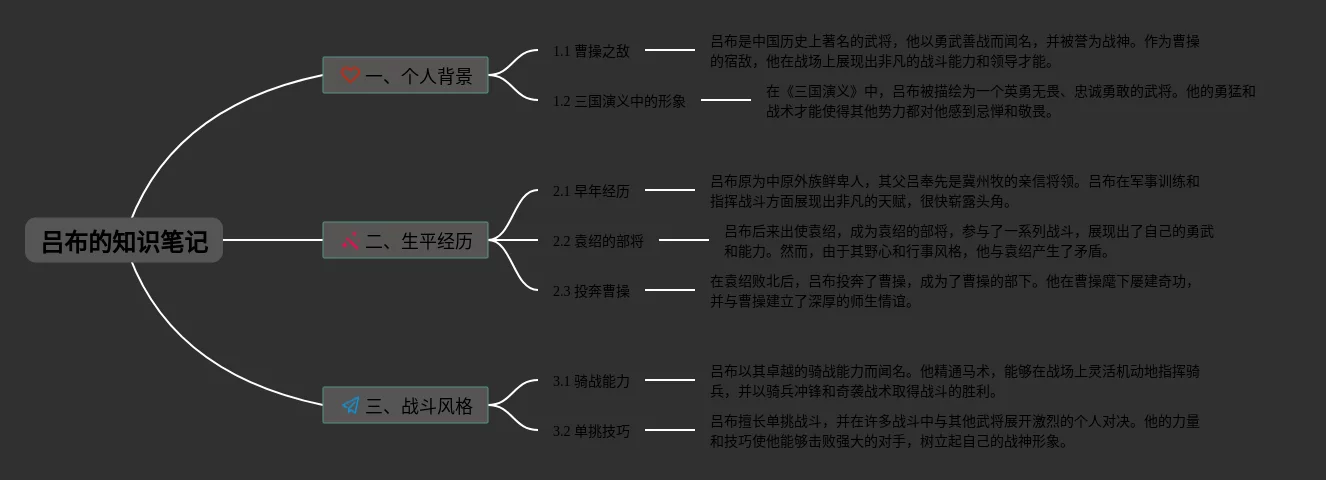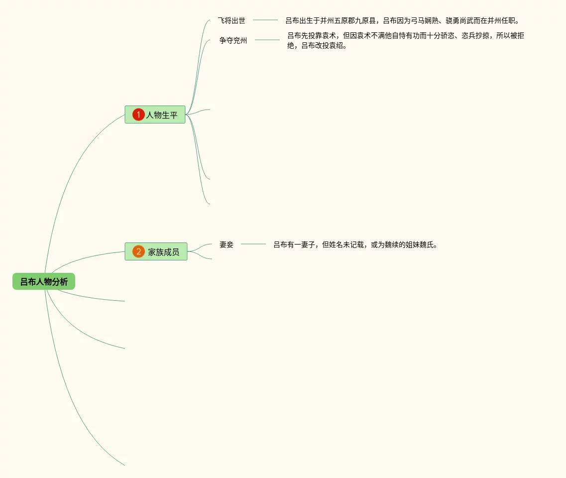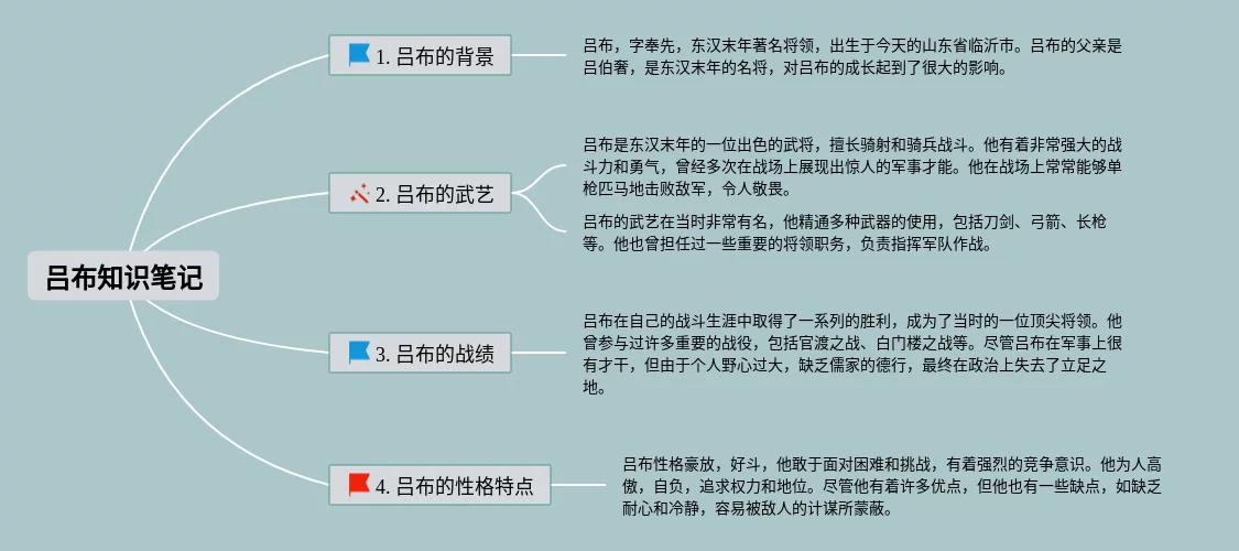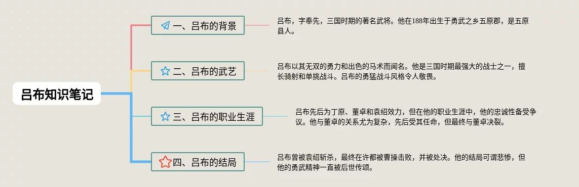 23张吕布的思维导图合集,吕布的思维导图,内容涵盖1. 吕布的背景、2. 吕布的武艺、3. 吕布的战绩、4. 吕布的性格特点等4个部分,23张高清晰可打印,每张思维导图都非常漂亮,每张图片均高清晰可打印。