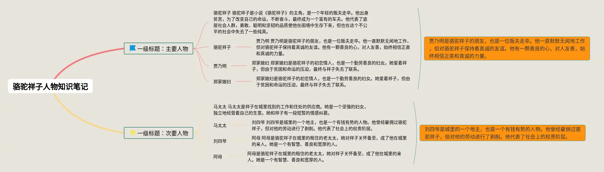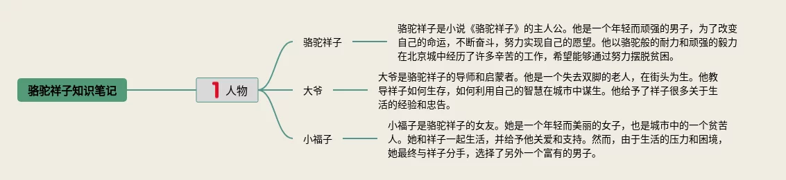 21张《骆驼祥子》人物思维导图合集,《骆驼祥子》人物思维导图,内容涵盖好句摘抄、读后感等2个要点,21张可打印,每张思维导图都非常漂亮,每张图片均可打印。