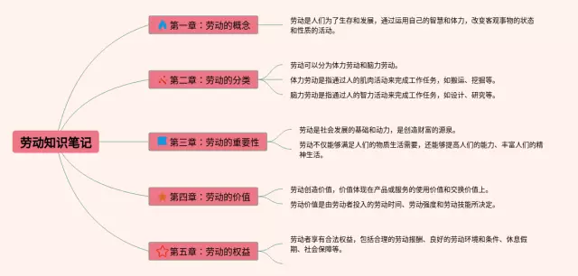 22张关于劳动思维导图合集,关于劳动思维导图,内容涵盖目录、基本概念、劳动合同、工作时间、职场安全等5个方面,22张值得收藏,每张思维导图都非常漂亮,每张图片均值得收藏。