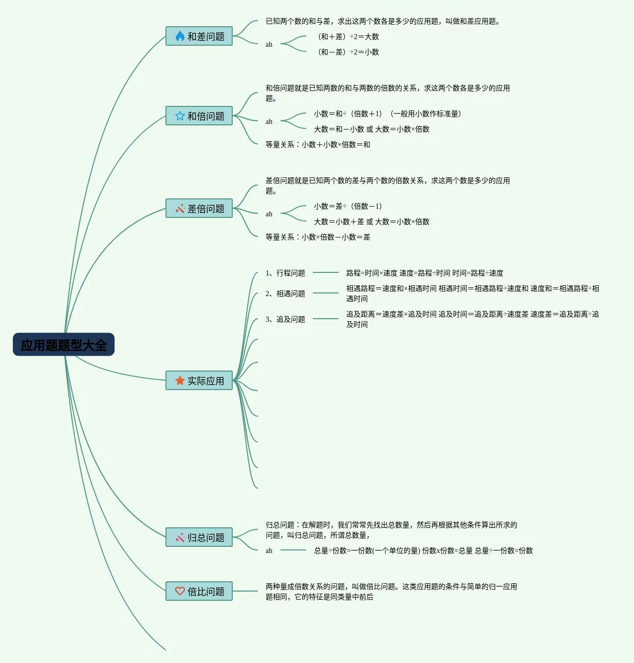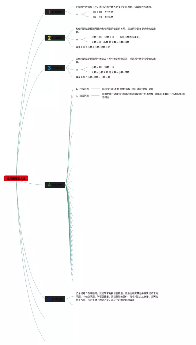 21张应用题类型思维导图合集,应用题类型思维导图,内容涵盖和差问题、和倍问题、差倍问题、实际应用、归总问题等7个方面,21张附下载,每张思维导图都非常简单,每张图片均附下载。