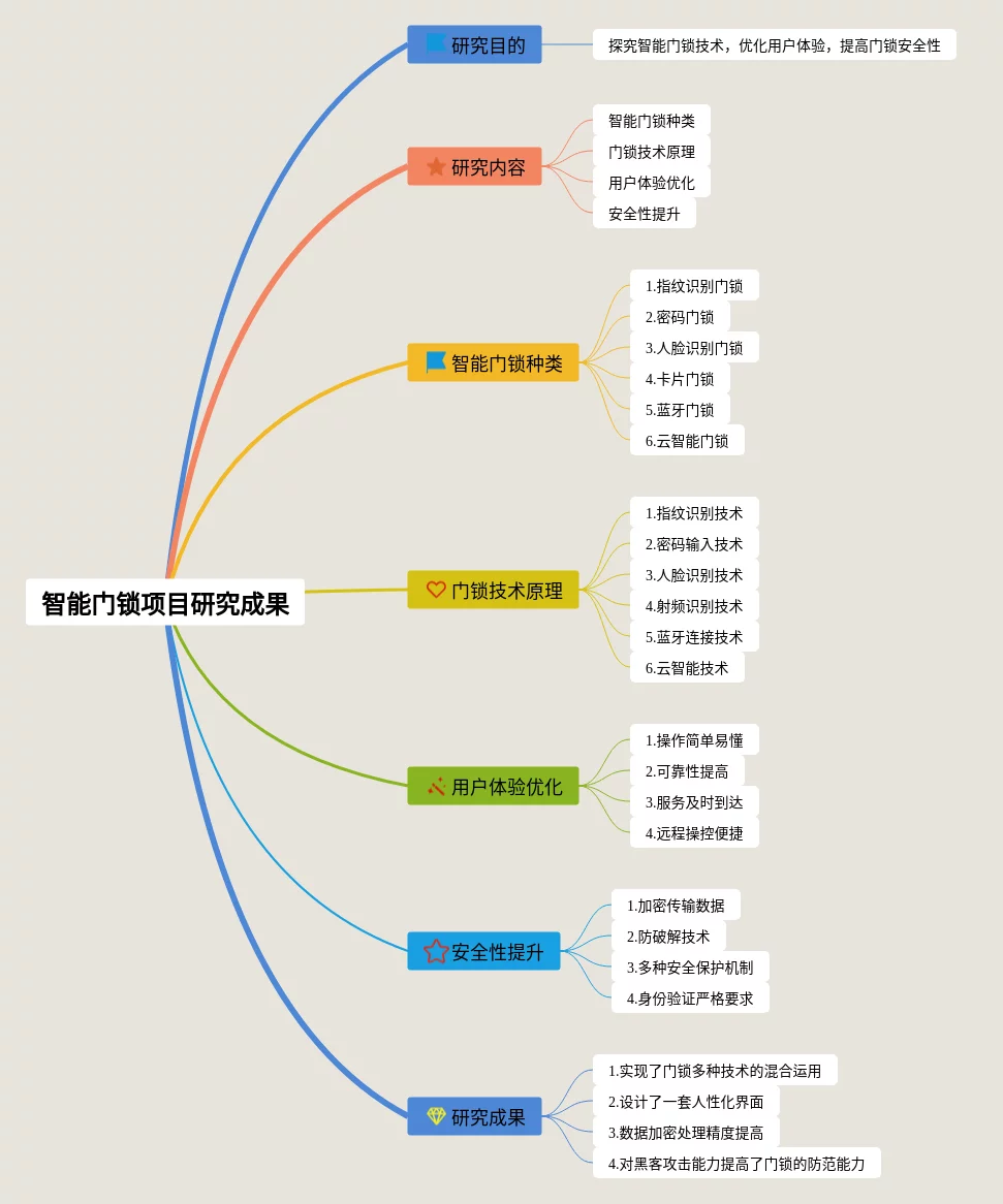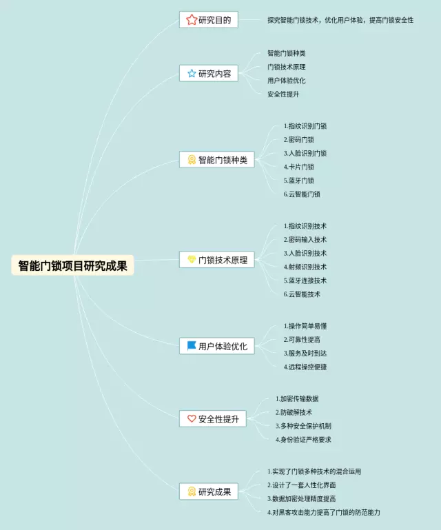 23张思维导图课题研究成果梳理汇总,思维导图课题研究成果梳理,内容涵盖研究目的、研究内容、智能门锁种类、门锁技术原理、用户体验优化等7个知识点,23张可下载,每张思维导图都非常漂亮,每张图片均可下载。