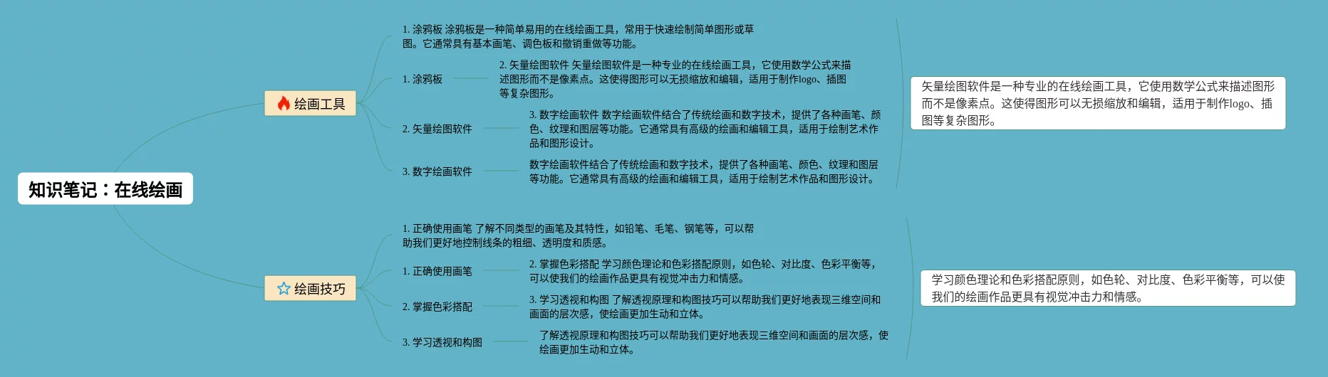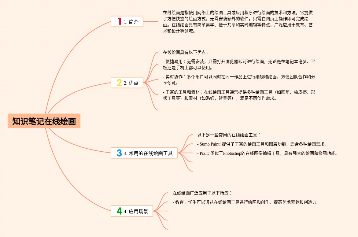 22张在线绘画思维导图合集,在线绘画思维导图,内容涵盖概述、优点、工具、使用步骤、应用场景等5个部分,22张值得收藏,每张思维导图都非常简单,每张图片均值得收藏。