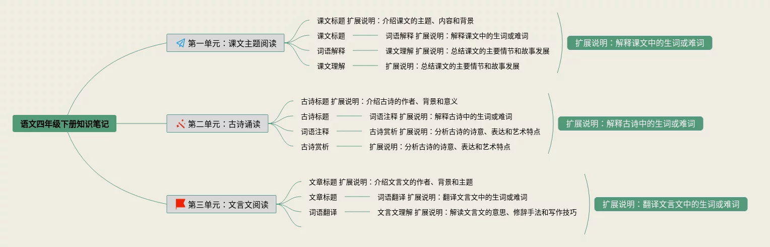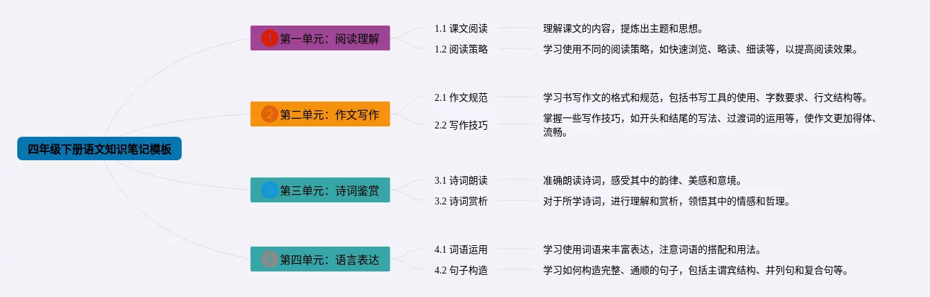22张四年级下册语文思维导图模板汇总,四年级下册语文思维导图模板,内容涵盖创作背景、翻译、赏析、创作背景、翻译、赏析等4个要点,22张值得收藏,每张思维导图都非常清晰,每张图片均值得收藏。