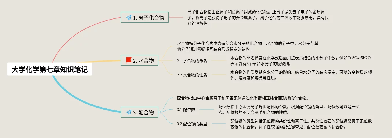 24张大学化学第七章思维导图汇总,大学化学第七章思维导图,内容涵盖1. 离子化合物、2. 水合物、3. 配合物等3个方面,24张高清版,每张思维导图都非常漂亮,每张图片均高清版。