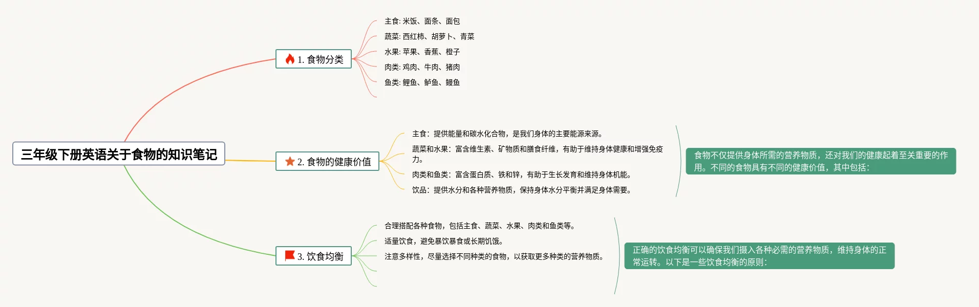 21张三年级下册英语关于食物的思维导图合集,三年级下册英语关于食物的思维导图,内容涵盖常见食物分类、食物的营养价值、饮食健康原则等3个知识点,21张附下载,每张思维导图都非常清晰,每张图片均附下载。