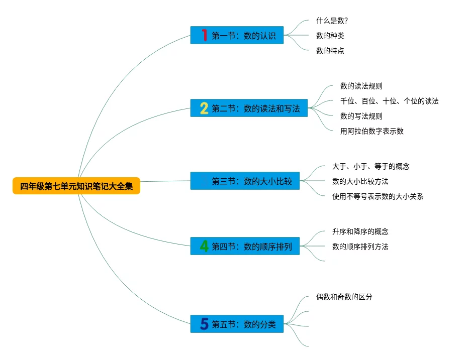 22张四年级上册语文思维导图大全集汇总,四年级上册语文思维导图大全集,内容涵盖第一节数的认识、第二节数的读法和写法、第三节数的大小比较、第四节数的顺序排列、第五节数的分类等5个部分,22张附下载,每张思维导图都非常简单,每张图片均附下载。