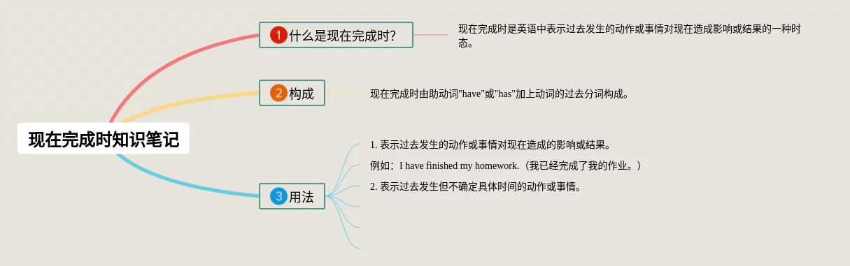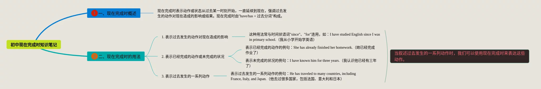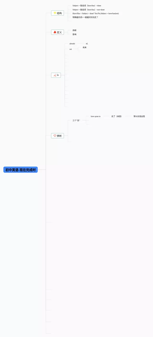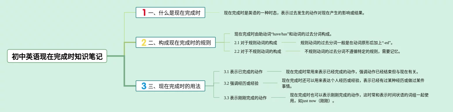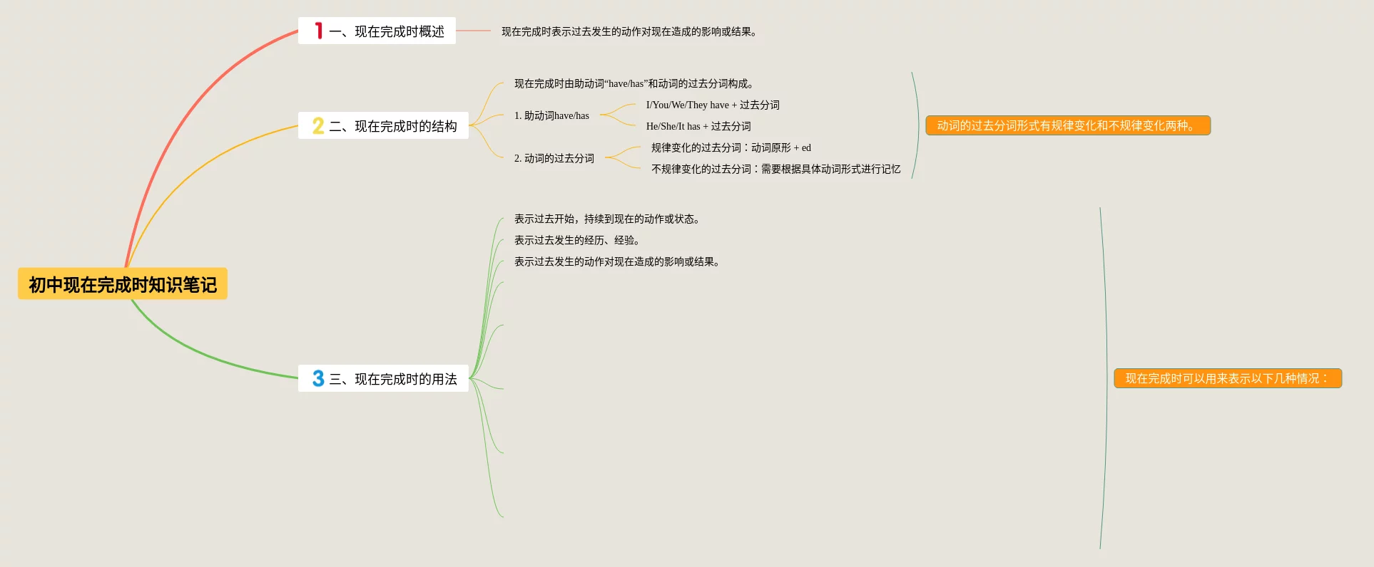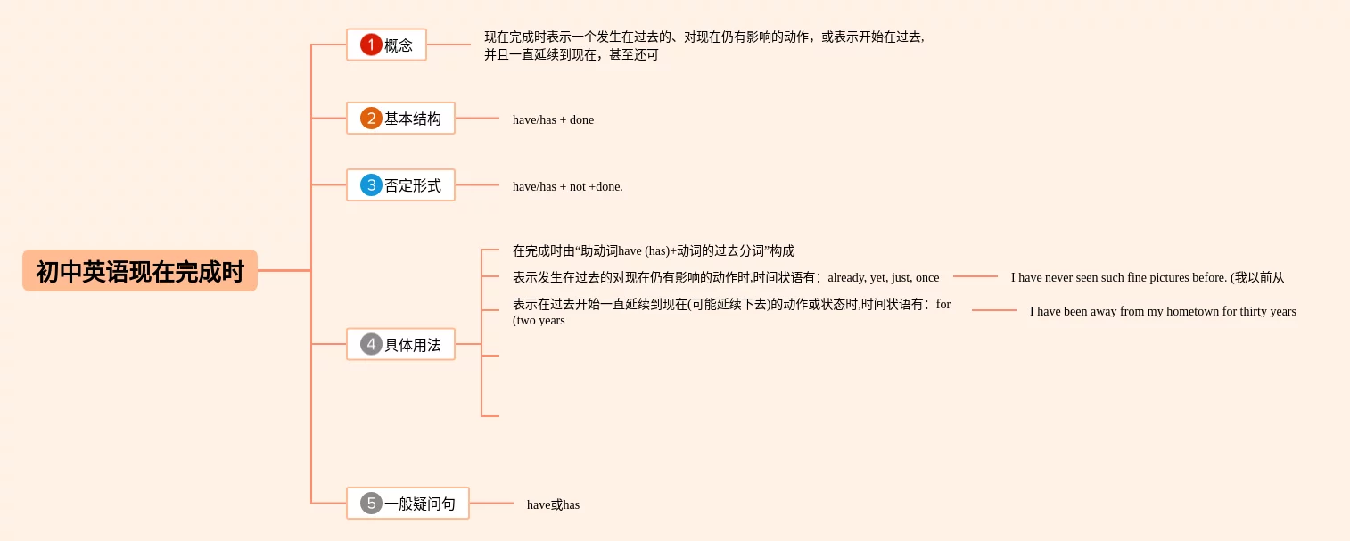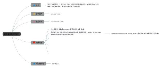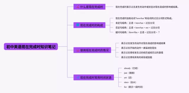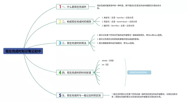 25张初中英语现在完成时思维导图合集,初中英语现在完成时思维导图,内容涵盖概念、与一般过去时的比较、格式、动词形式、时间状语等7个部分,25张附打印高清版,每张思维导图都非常清晰,每张图片均附打印高清版。