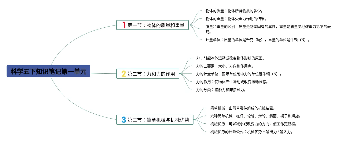 24张五下科学思维导图第一单元合集,五下科学思维导图第一单元,内容涵盖第一节物体的质量和重量、第二节力和力的作用、第三节简单机械与机械优势等3个知识点,24张可打印,每张思维导图都非常漂亮,每张图片均可打印。