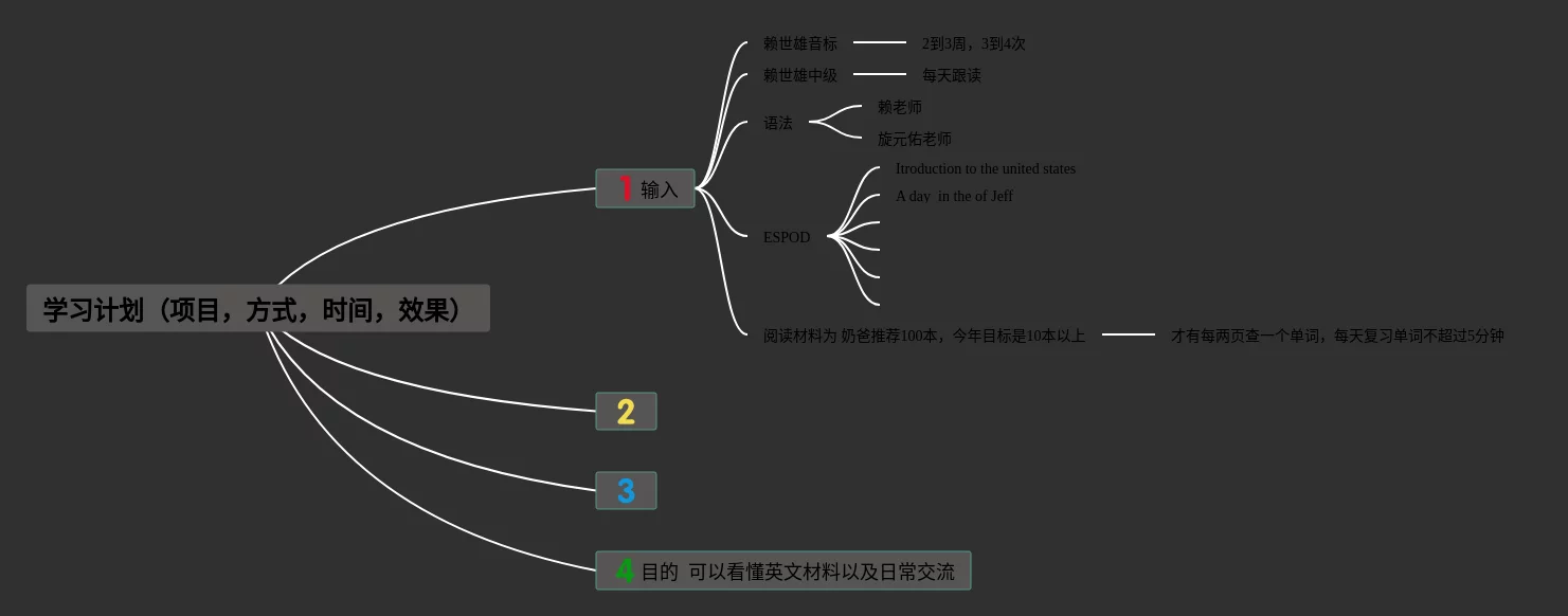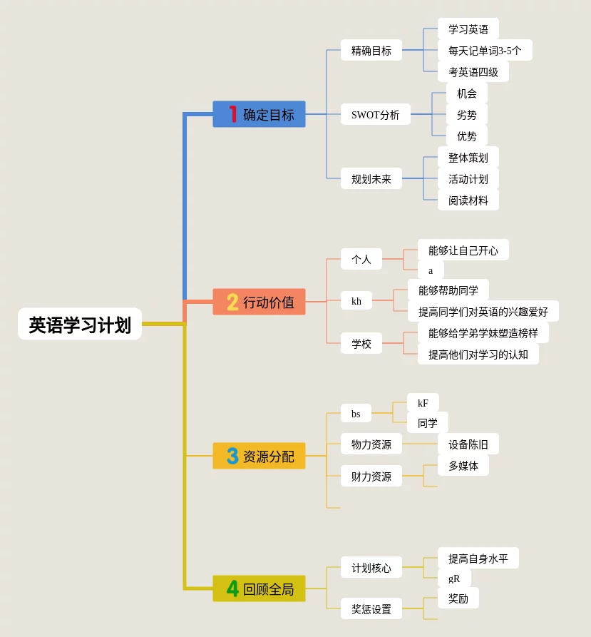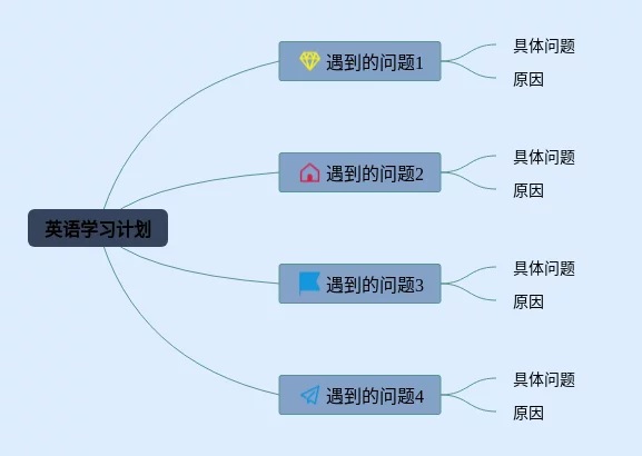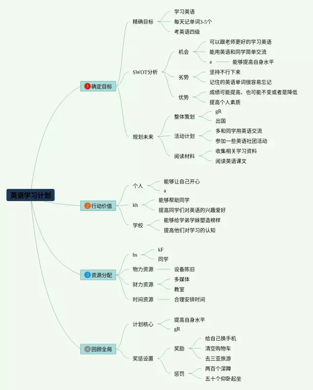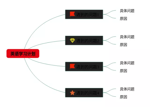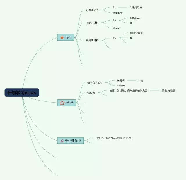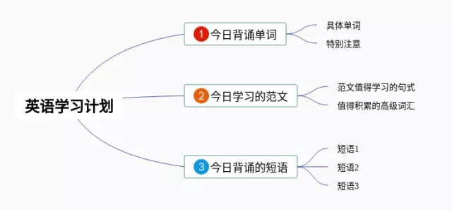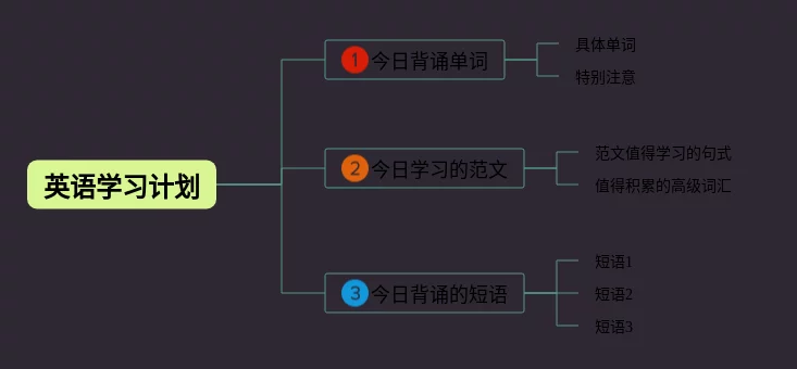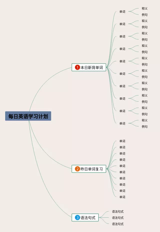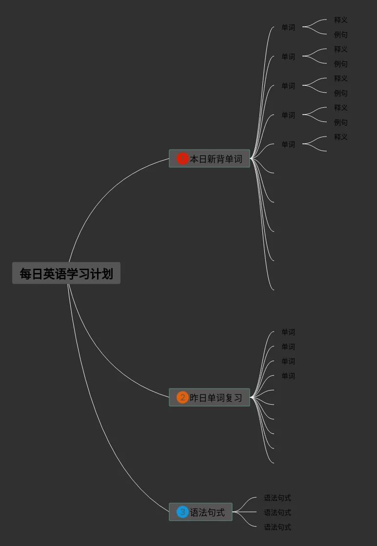 25张英语学习计划思维导图合集,英语学习计划思维导图,内容涵盖本日新背单词、昨日单词复习、语法句式等3个知识点,25张高清版,每张思维导图都非常简单,每张图片均高清版。
