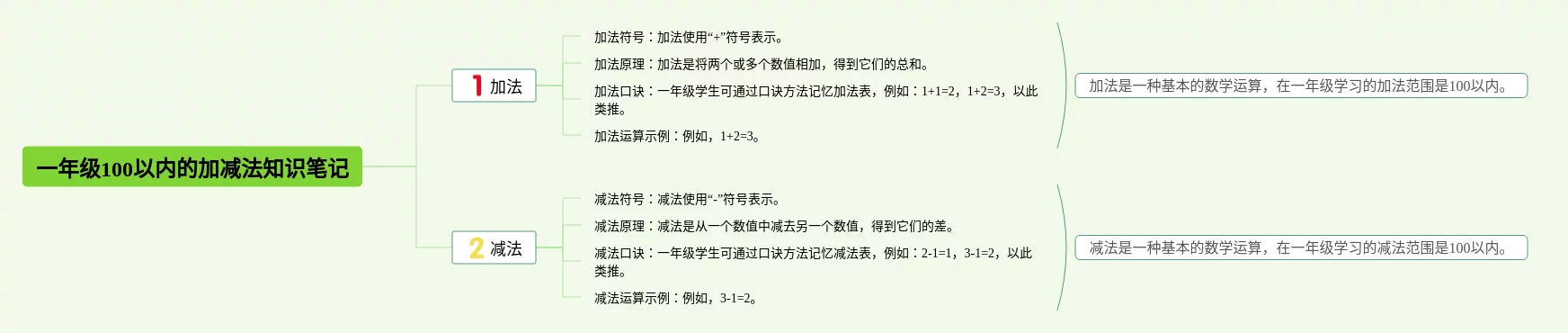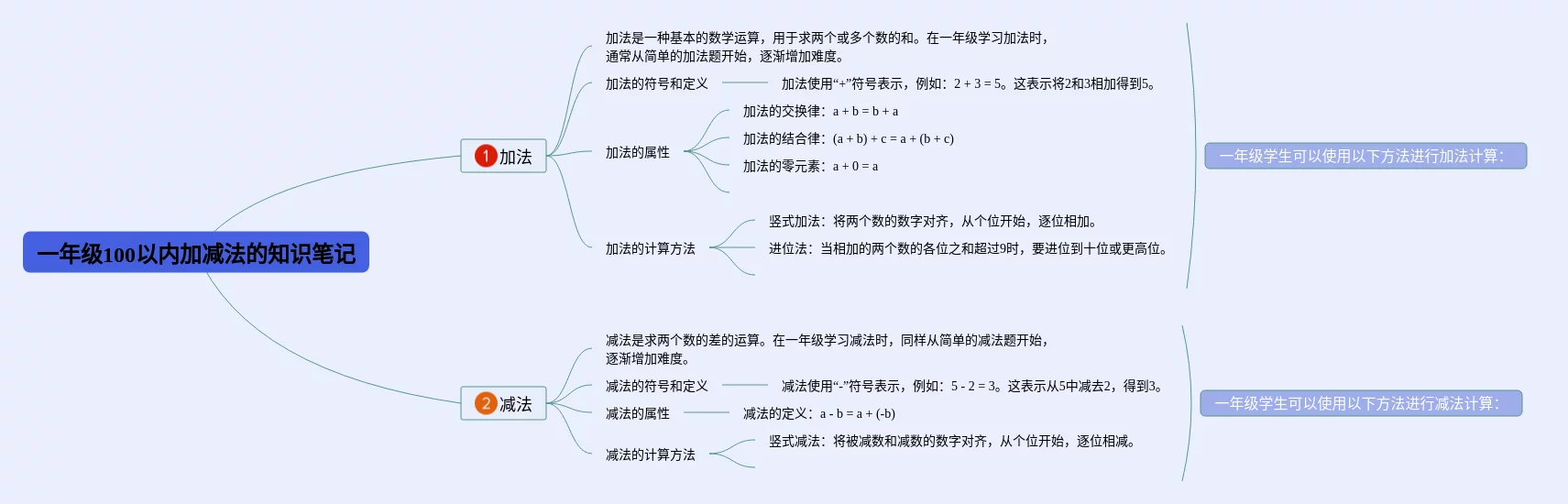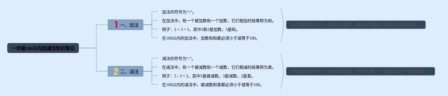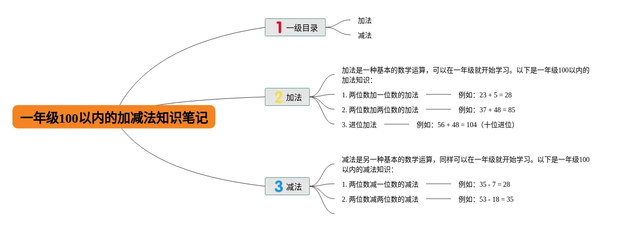 25张一年级一百以内的加减法思维导图汇总,一年级一百以内的加减法思维导图,内容涵盖一级目录、加法、减法等3个方面,25张可打印,每张思维导图都非常清晰,每张图片均可打印。