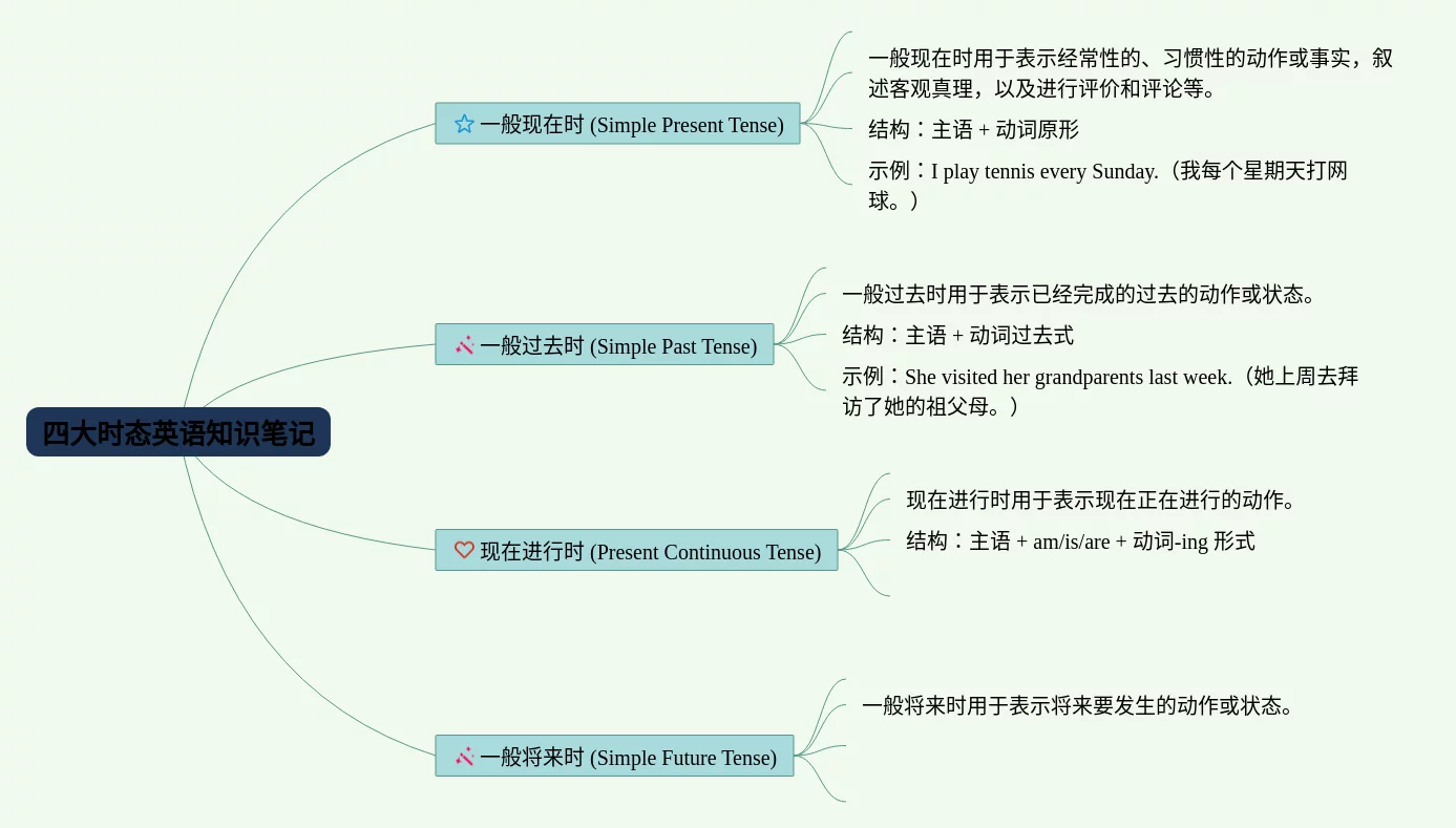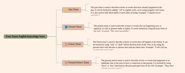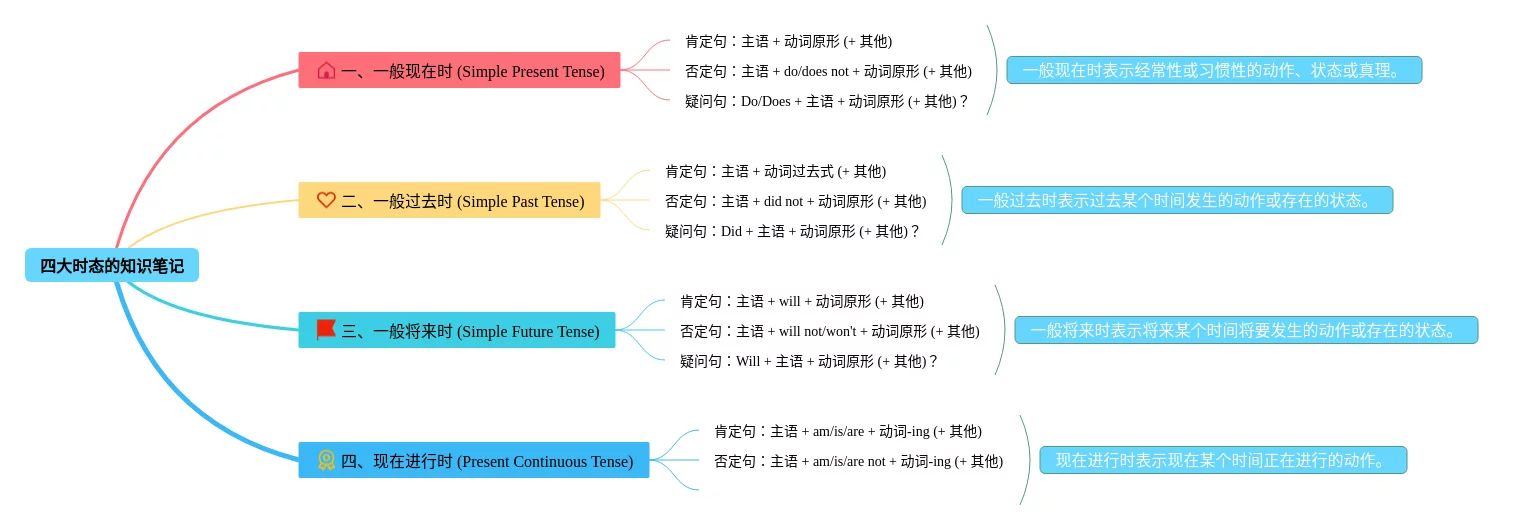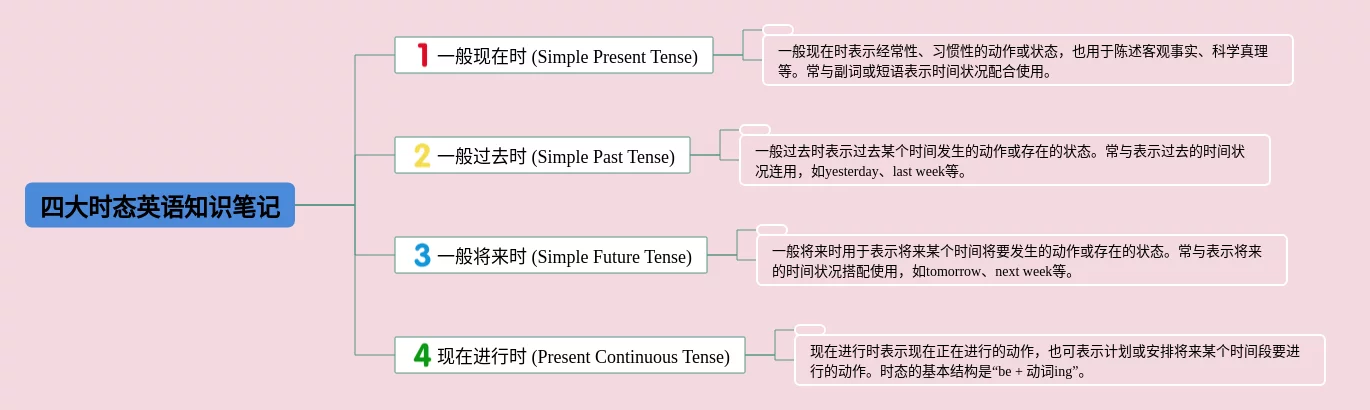 23张英语的四大时态思维导图汇总,英语的四大时态思维导图,内容涵盖一般现在时 (Simple Present Tense)、一般过去时 (Simple Past Tense)、一般将来时 (Simple Future Tense)、现在进行时 (Present Continuous Tense)、过去进行时 (Past Continuous Tense)等9个方面,23张可下载,每张思维导图都非常清晰,每张图片均可下载。
