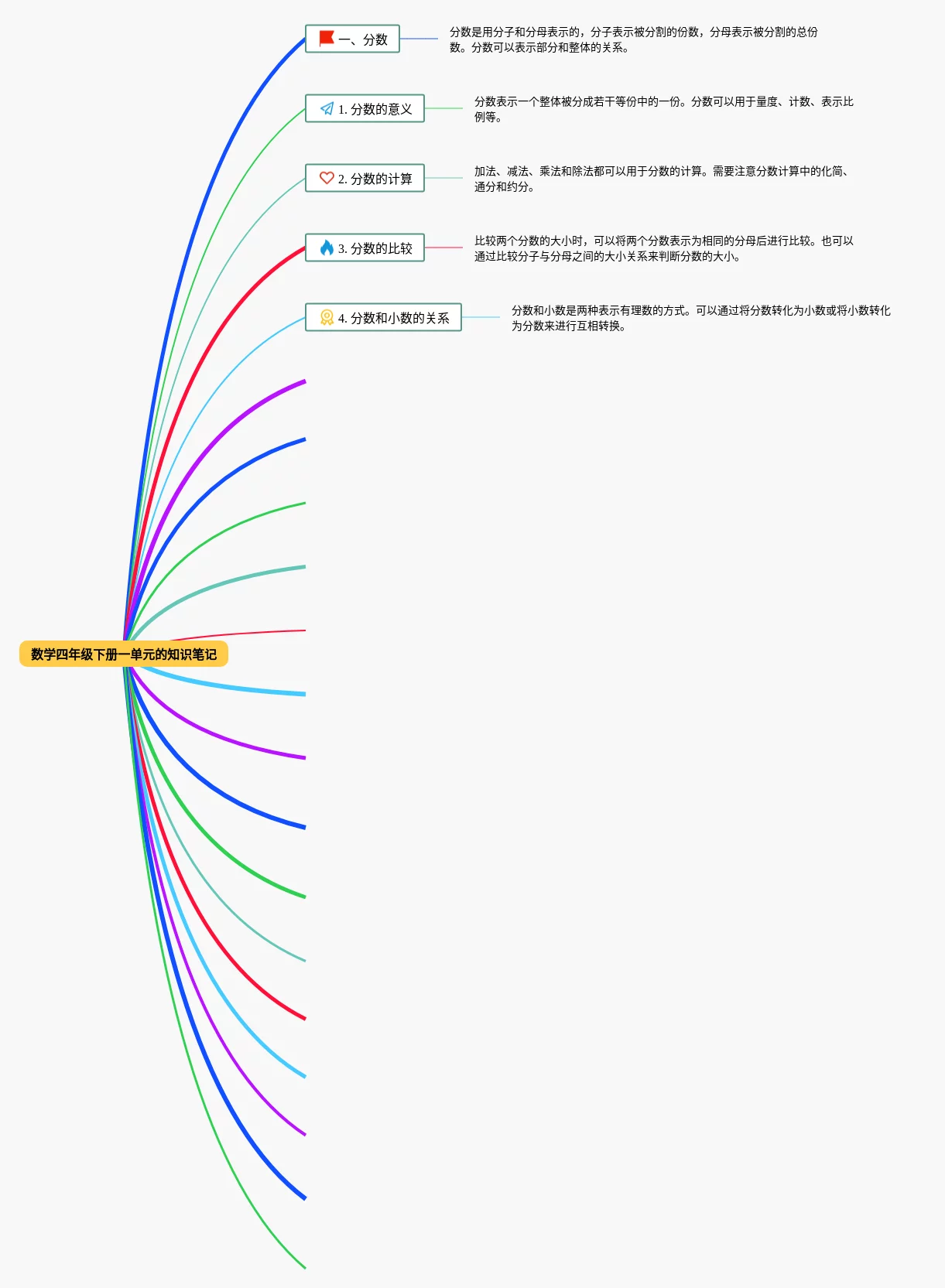 23张数学四年级下册一单元思维导图合集,数学四年级下册一单元思维导图,内容涵盖分数、1. 分数的意义、2. 分数的计算、3. 分数的比较、4. 分数和小数的关系等27个要点,23张值得收藏,每张思维导图都非常漂亮,每张图片均值得收藏。