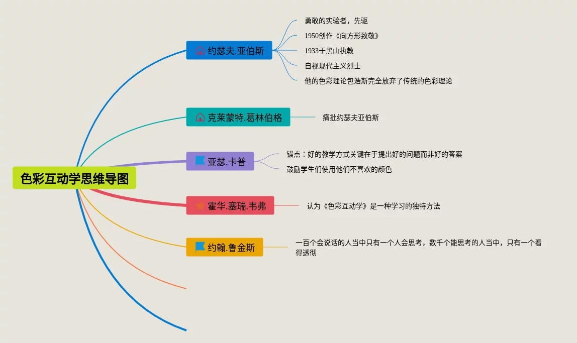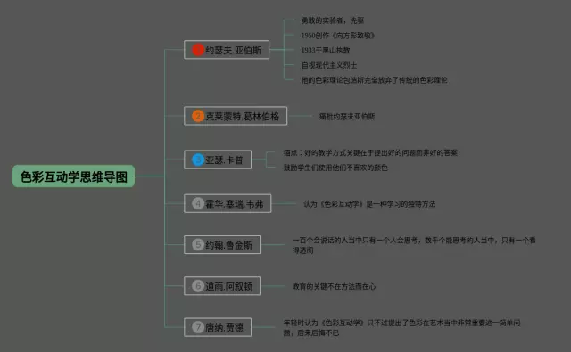22张色彩思维导图合集,色彩思维导图,内容涵盖约瑟夫.亚伯斯、克莱蒙特.葛林伯格、亚瑟.卡普、霍华.塞瑞.韦弗、约翰.鲁金斯等7个知识点,22张高清晰可打印,每张思维导图都非常清晰,每张图片均高清晰可打印。