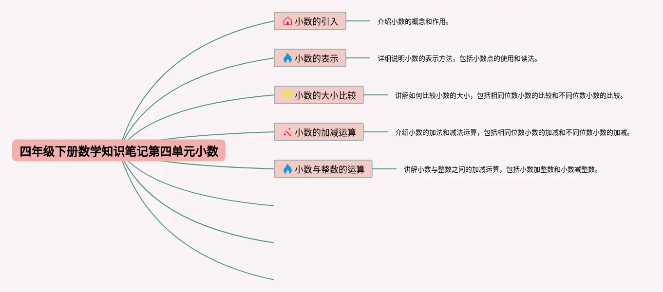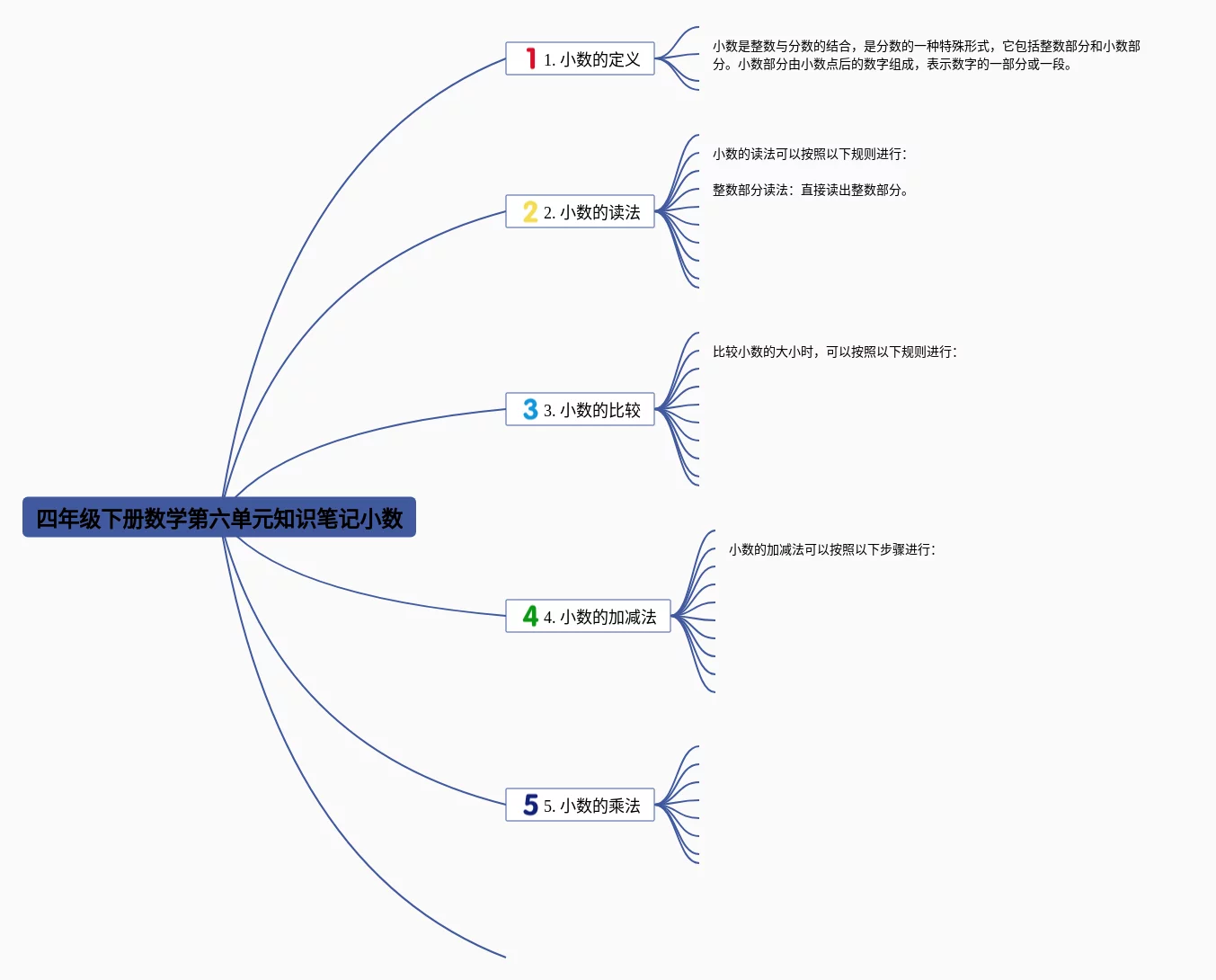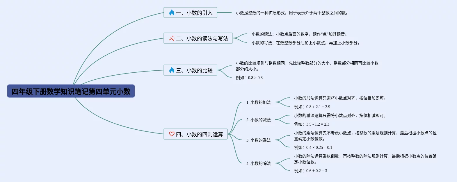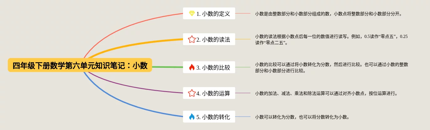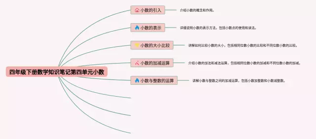 25张四年级下册数学小数单元思维导图合集,四年级下册数学小数单元思维导图,内容涵盖第一章 小数的认识、第二章 小数的读写、第三章 小数的比较、第四章 小数的四则运算、第五章 小数与分数的转换等6个部分,25张可下载,每张思维导图都非常漂亮,每张图片均可下载。