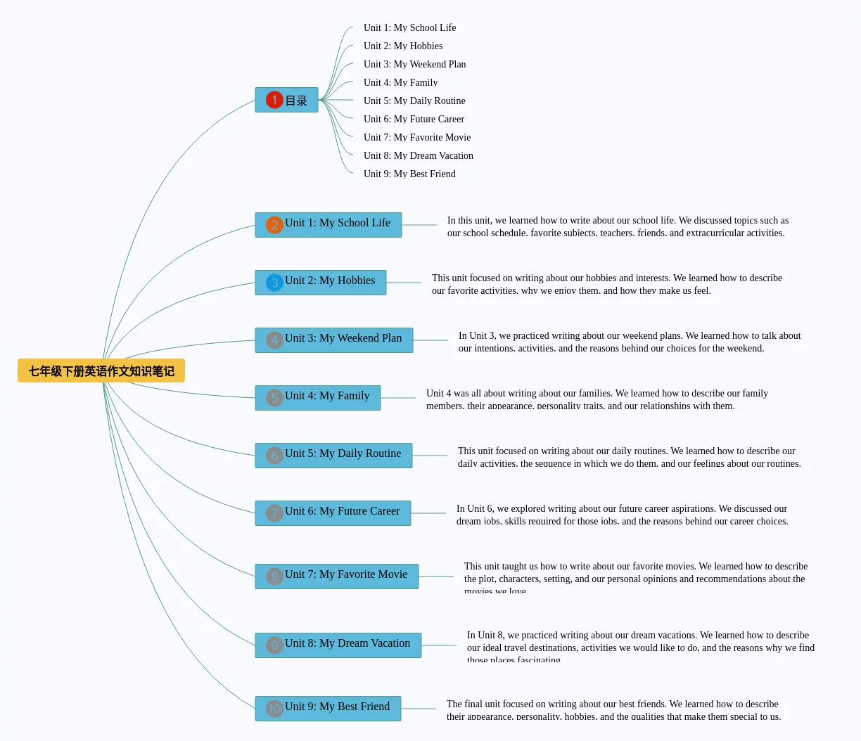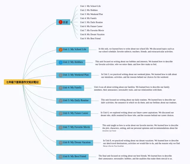 21张七年级下册语文作文思维导图合集,七年级下册语文作文思维导图,内容涵盖语文答题模板、环境描写、说明文等3个方面,21张高清晰可打印,每张思维导图都非常简单,每张图片均高清晰可打印。