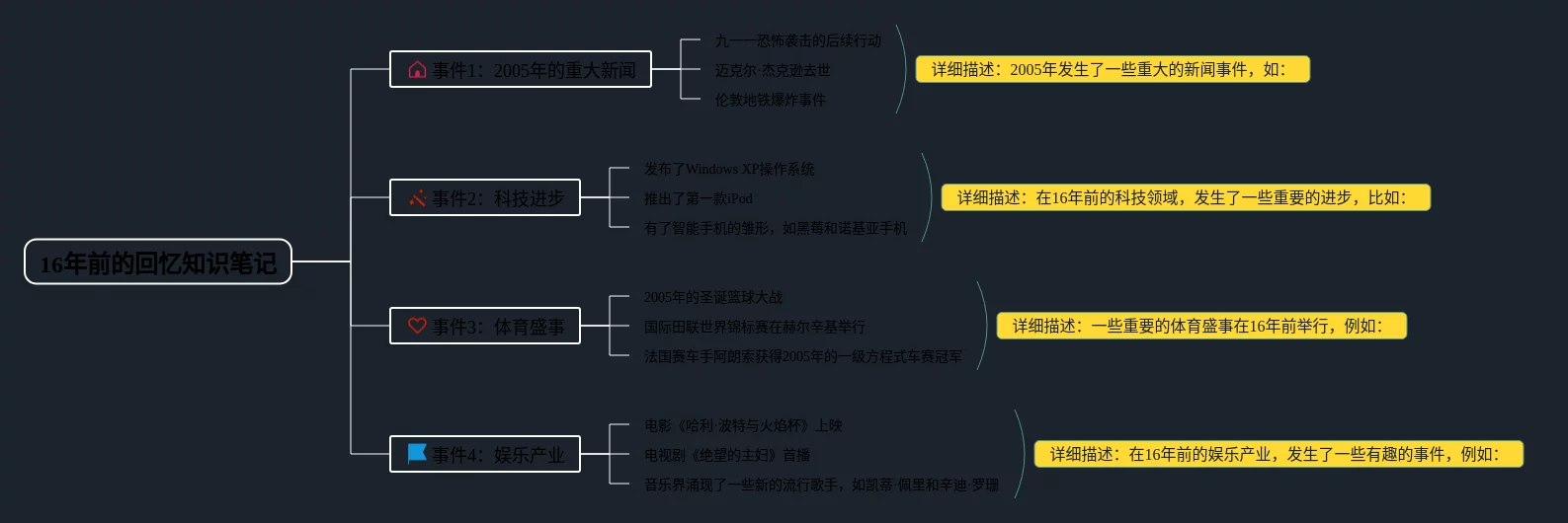 25张16年前的回忆思维导图简单合集,16年前的回忆思维导图简单,内容涵盖事件2005年的重大新闻、事件科技进步、事件体育盛事、事件娱乐产业等4个方面,25张高清版,每张思维导图都非常清晰,每张图片均高清版。