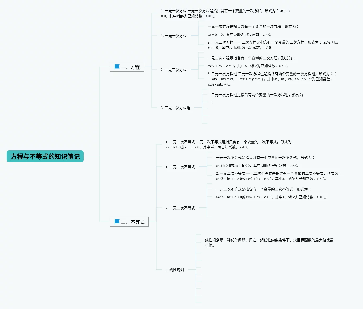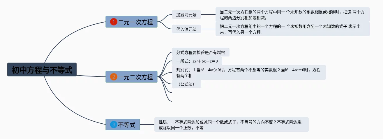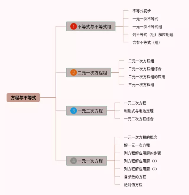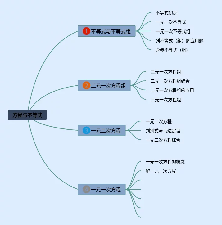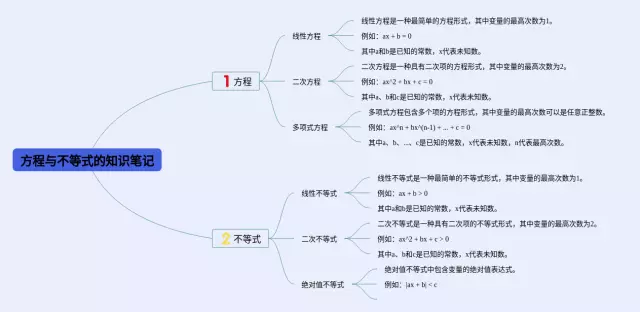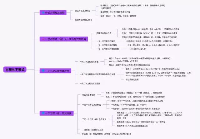 21张方程与不等式的思维导图汇总,方程与不等式的思维导图,内容涵盖不等式与不等式组、二元一次方程组、一元二次方程、一元一次方程等4个知识点,21张高清版,每张思维导图都非常清晰,每张图片均高清版。