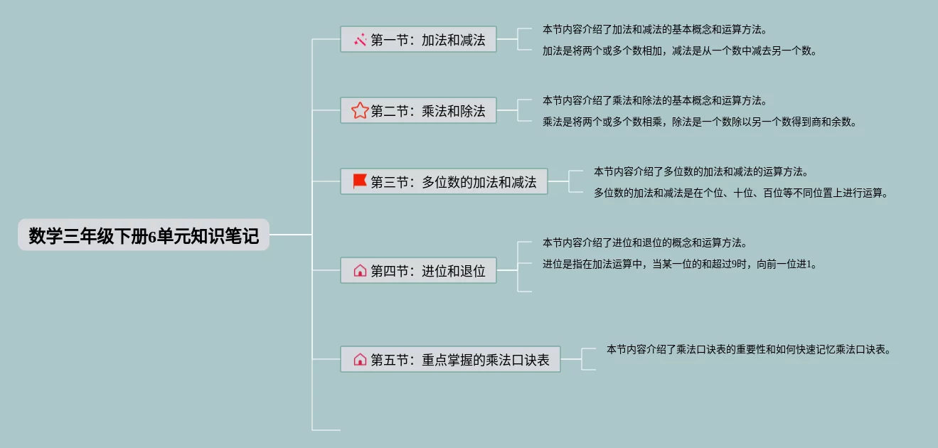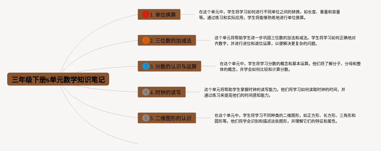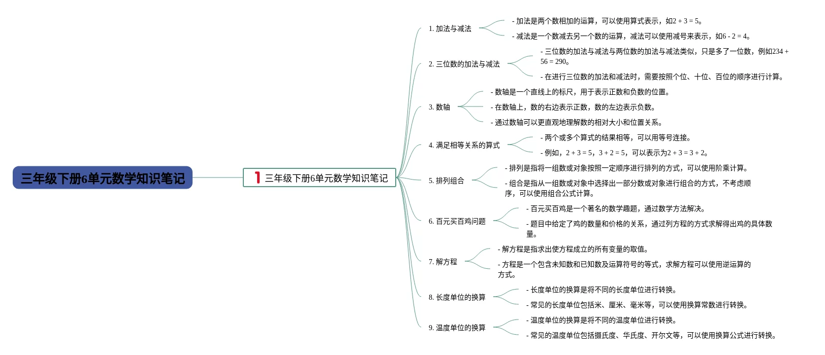 23张三年级下册6单元数学思维导图汇总,三年级下册6单元数学思维导图,内容涵盖三年级下册6单元数学知识笔记、1. 加法与减法、2. 三位数的加法与减法、3. 数轴、4. 满足相等关系的算式等10个部分,23张可下载,每张思维导图都非常漂亮,每张图片均可下载。