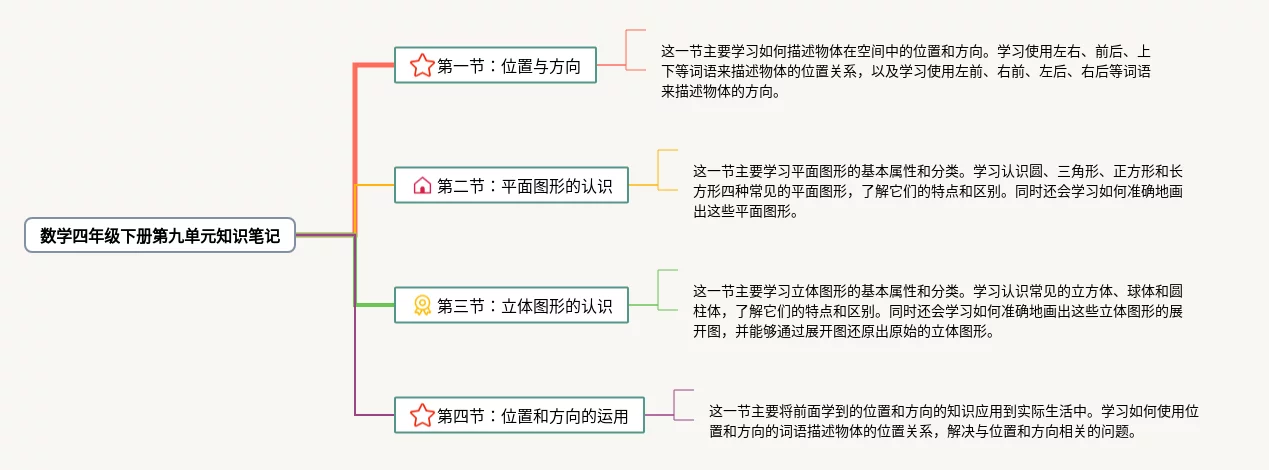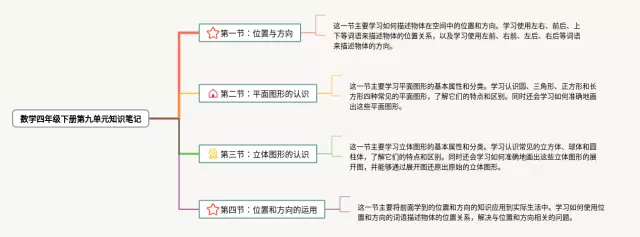 四年级下册第九单元思维导图合集,数学思维导图第九单元四年级下册,内容涵盖第一节位置与方向、第二节平面图形的认识、第三节立体图形的认识、第四节位置和方向的运用等4个方面,20张附下载,每张思维导图都非常清晰,每张图片均附下载。