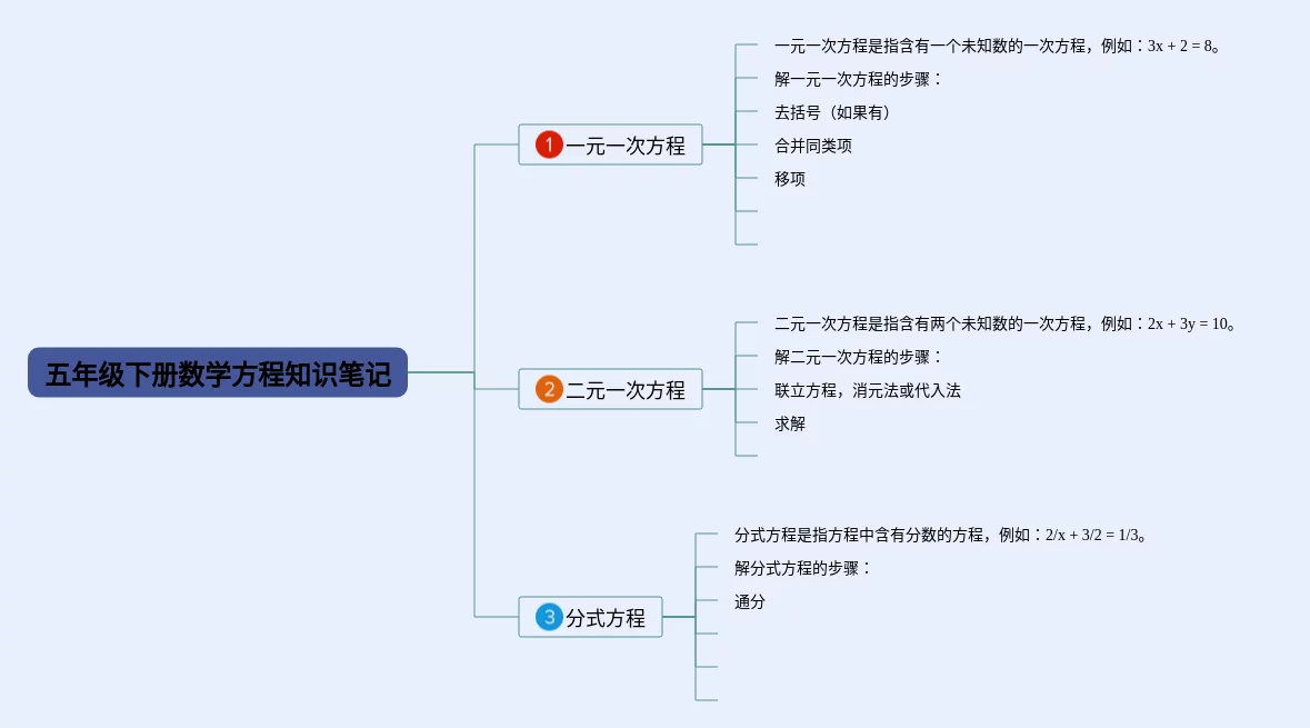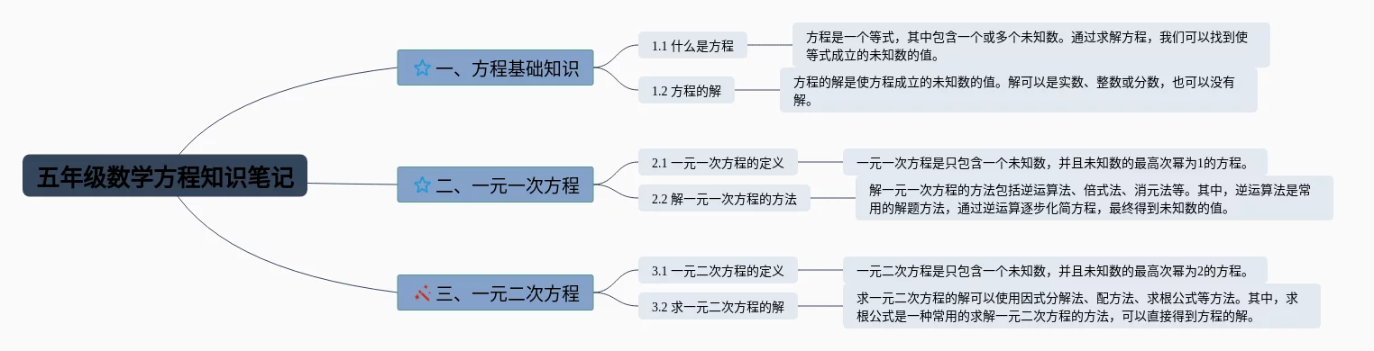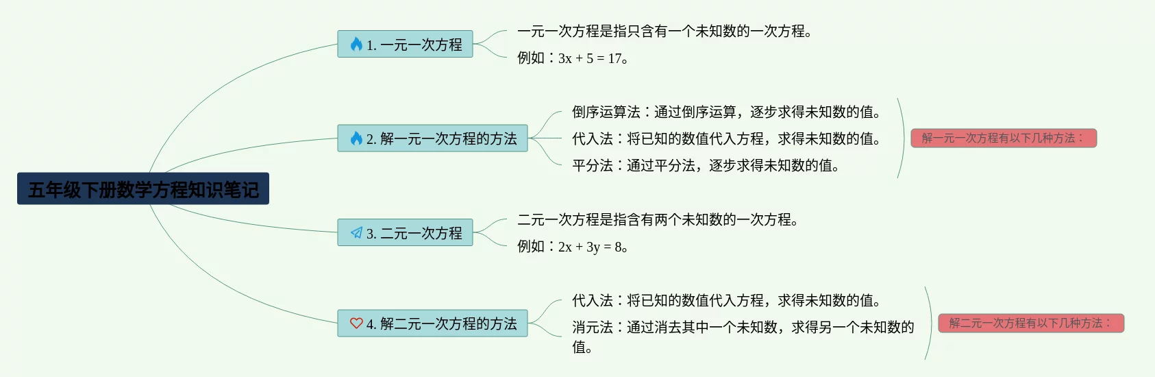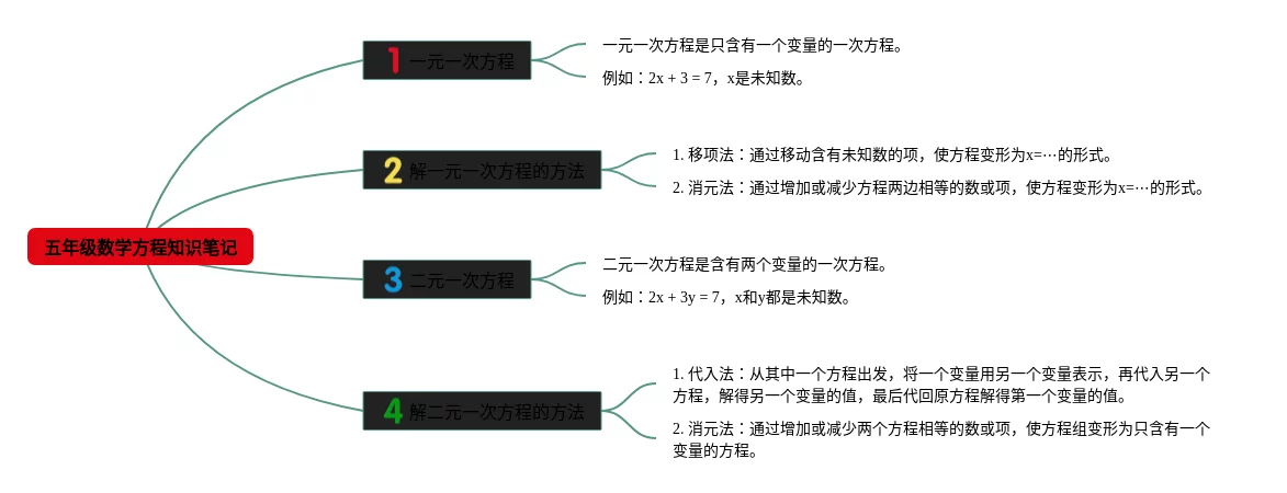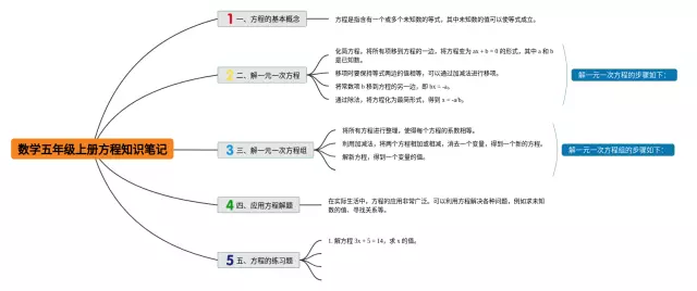 23张数学五年级下册方程思维导图汇总,数学五年级下册方程思维导图,内容涵盖方程的基本概念、方程的解、一元一次方程、方程组等4个部分,23张可下载,每张思维导图都非常简单,每张图片均可下载。