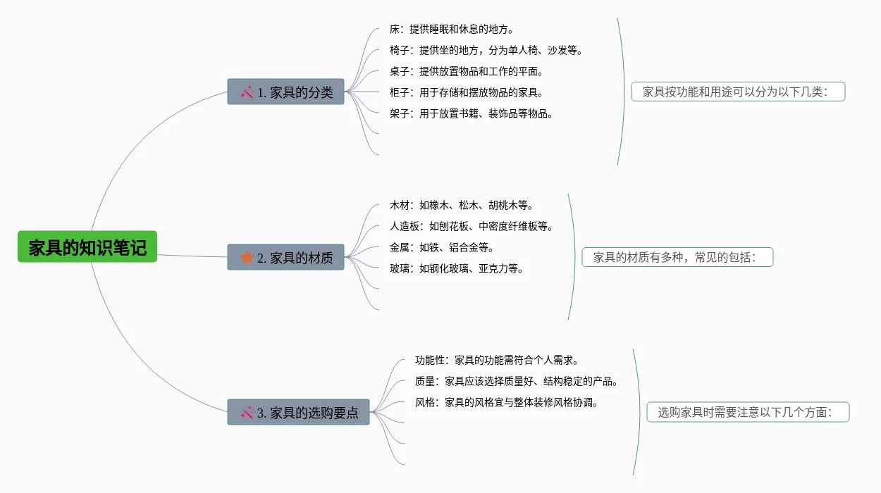 24张关于家具的思维导图汇总,关于家具的思维导图,内容涵盖1. 家具分类、2. 家具材质等2个要点,24张值得收藏,每张思维导图都非常简单,每张图片均值得收藏。
