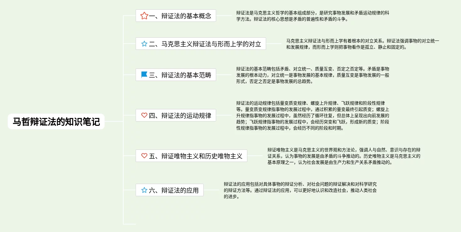 22张马哲辩证法的思维导图汇总,马哲辩证法的思维导图,内容涵盖辩证法的基本概念、辩证法的基本范畴、辩证法的运动规律、辩证唯物主义和历史唯物主义、辩证法的应用等6个要点,22张高清晰可打印,每张思维导图都非常漂亮,每张图片均高清晰可打印。