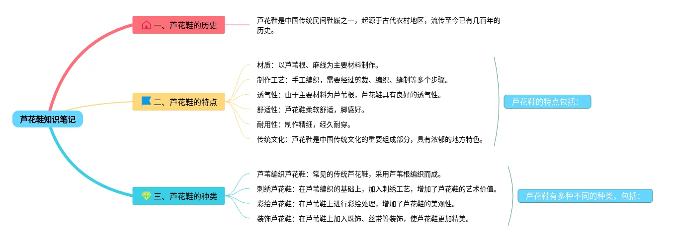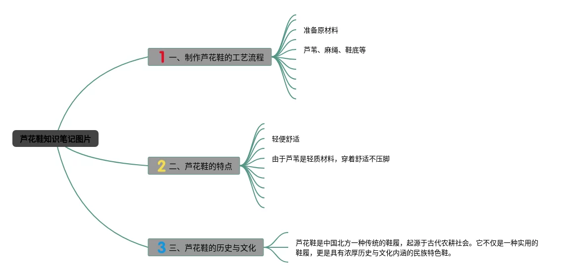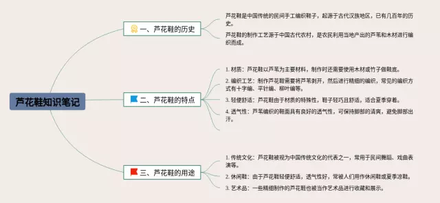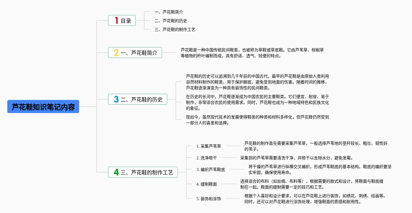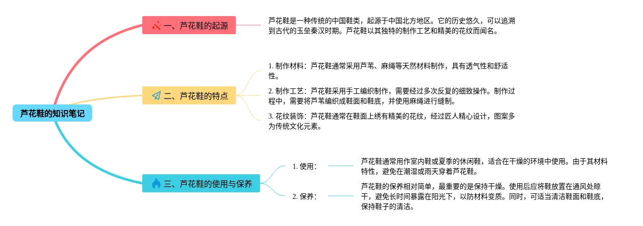 22张芦花鞋的思维导图合集,芦花鞋的思维导图,内容涵盖芦花鞋的起源、芦花鞋的特点、芦花鞋的使用与保养等3个方面,22张可打印,每张思维导图都非常简单,每张图片均可打印。