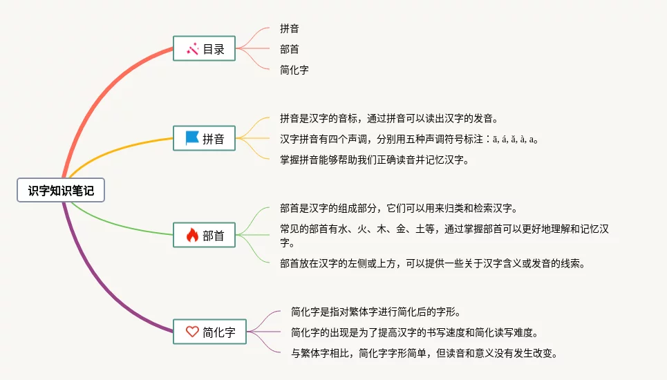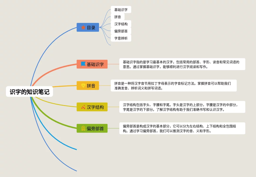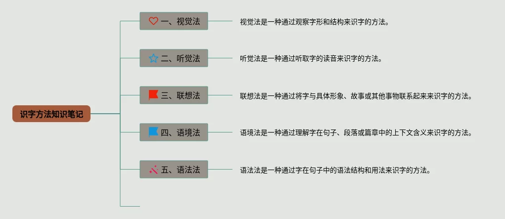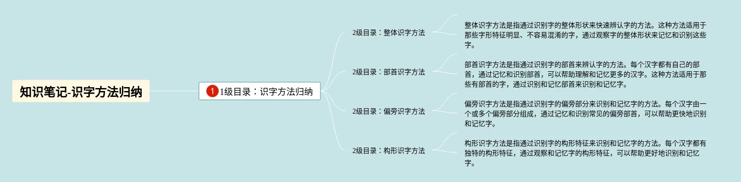 24张识字思维导图汇总,识字思维导图,内容涵盖1级目录识字方法归纳、2级目录整体识字方法、2级目录部首识字方法、2级目录偏旁识字方法、2级目录构形识字方法等5个部分,24张可下载,每张思维导图都非常清晰,每张图片均可下载。