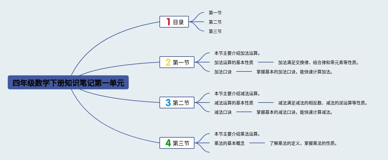 四年级下册第一单元思维导图合集,四年级数学下册第一单元思维导图,内容涵盖目录、第一节、第二节、第三节等4个方面,20张可打印,每张思维导图都非常漂亮,每张图片均可打印。
