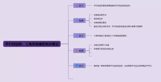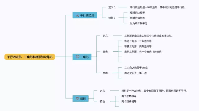 21张三角形平行四边形和梯形的思维导图汇总,三角形平行四边形和梯形的思维导图,内容涵盖平行四边形、梯形、三角形等3个部分,21张高清晰可打印,每张思维导图都非常清晰,每张图片均高清晰可打印。