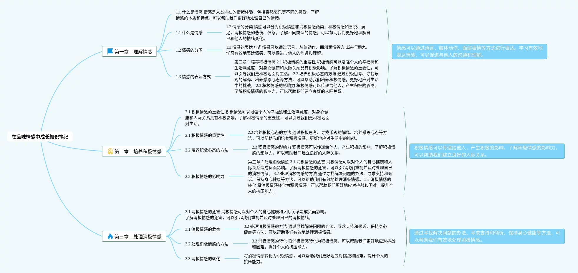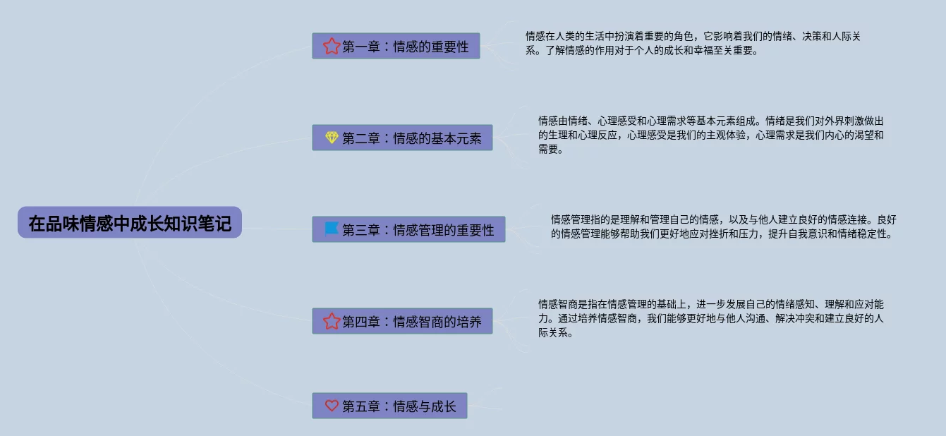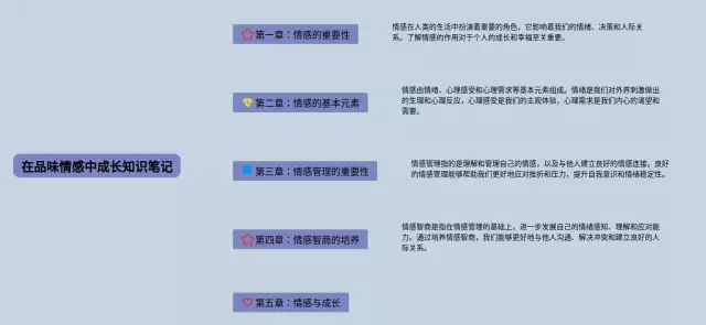 25张在品味情感中成长思维导图合集,在品味情感中成长思维导图,内容涵盖第一章情感的重要性、第二章情感的基本元素、第三章情感管理的重要性、第四章情感智商的培养、第五章情感与成长等5个方面,25张附打印高清版,每张思维导图都非常清晰,每张图片均附打印高清版。