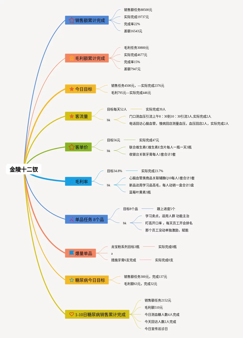 25张金陵十二钗思维导图合集,金陵十二钗思维导图,内容涵盖销售额累计完成、毛利额累计完成、今日目标、客流量、客单价等12个部分,25张附下载,每张思维导图都非常漂亮,每张图片均附下载。
