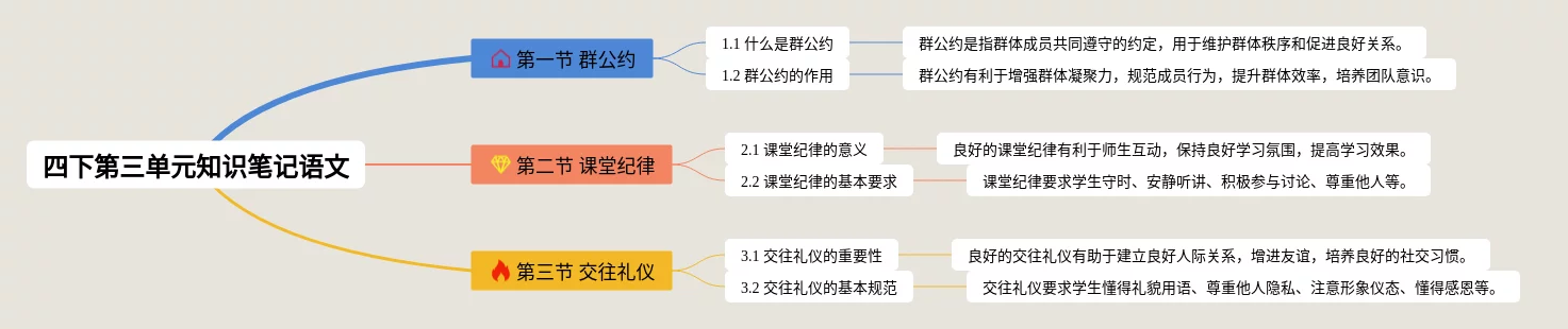 四下第三单元思维导图汇总,四下第三单元思维导图语文,内容涵盖第一节 群公约、第二节 课堂纪律、第三节 交往礼仪等3个方面,25张高清版,每张思维导图都非常漂亮,每张图片均高清版。