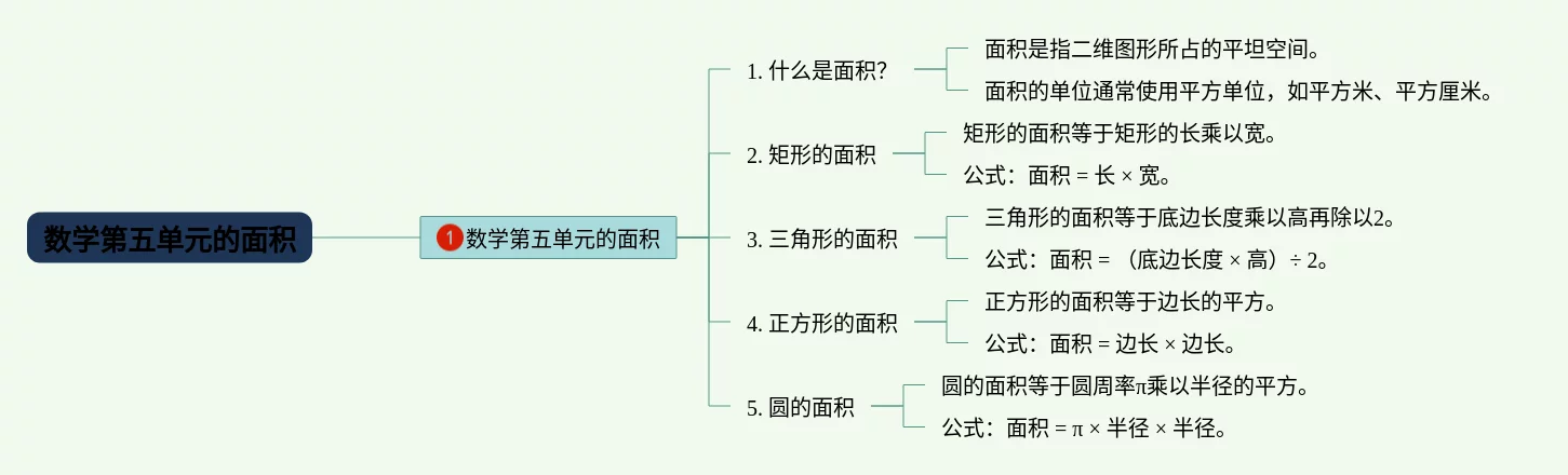 25张三年级下册的数学第五单元面积的思维导图汇总,三年级下册的数学第五单元面积的思维导图,内容涵盖1. 什么是面积、2. 计算面积的单位、3. 正方形的面积、4. 长方形的面积、5. 三角形的面积等5个方面,25张可打印,每张思维导图都非常简单,每张图片均可打印。
