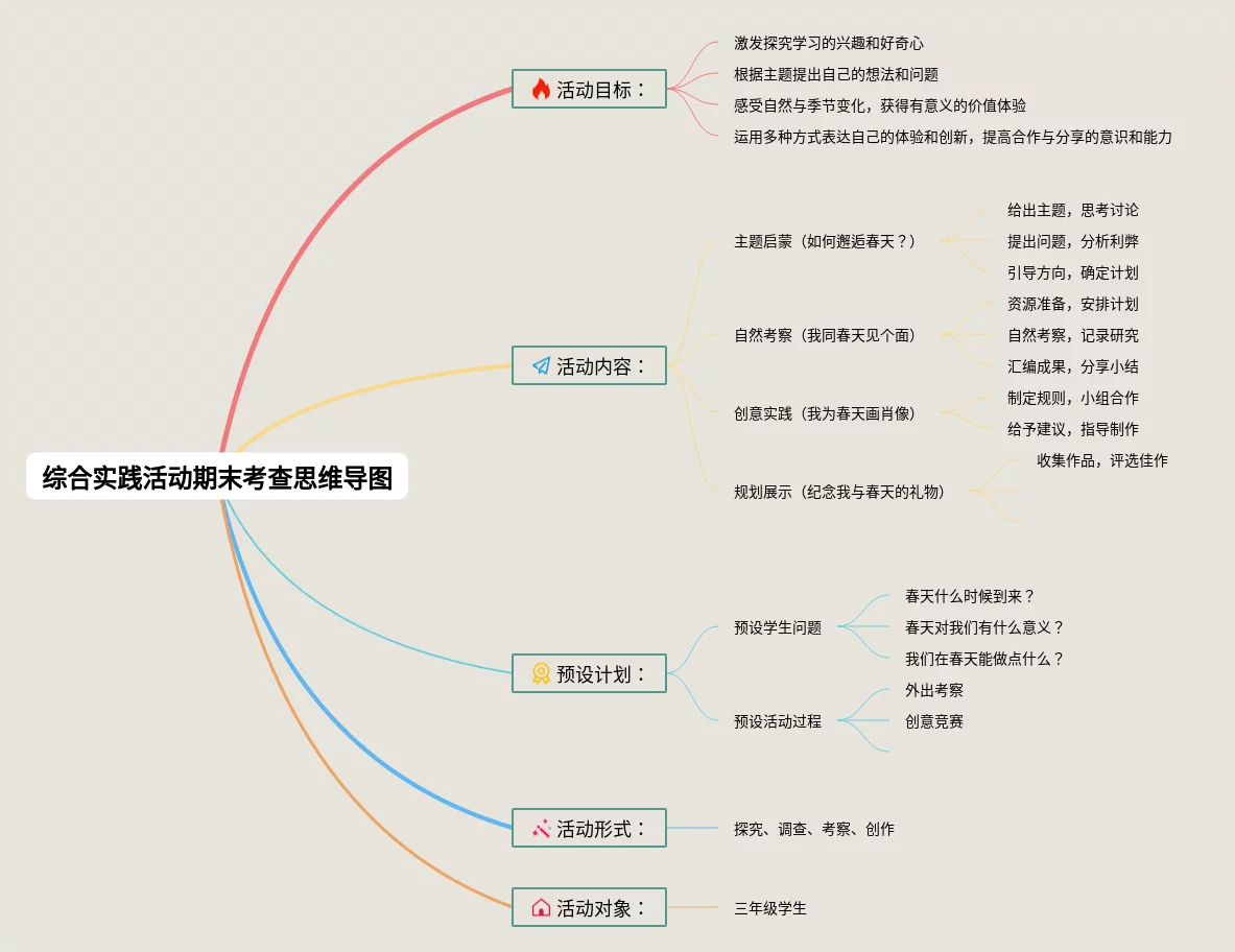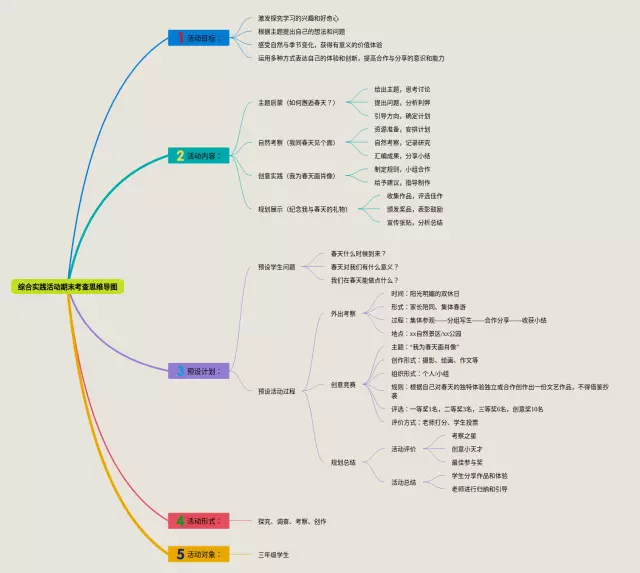 20张三年级综合实践思维导图合集,三年级综合实践思维导图,内容涵盖活动目标、活动内容、预设计划、活动形式、活动对象等5个方面,20张高清晰可打印,每张思维导图都非常漂亮,每张图片均高清晰可打印。