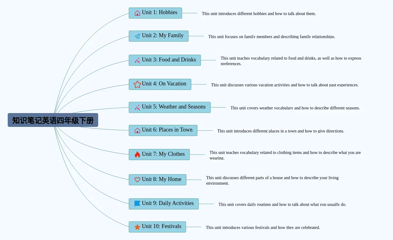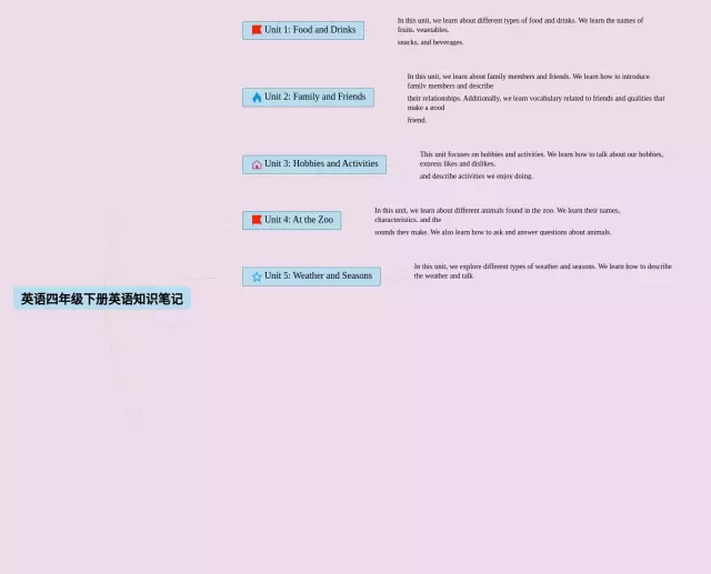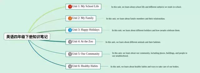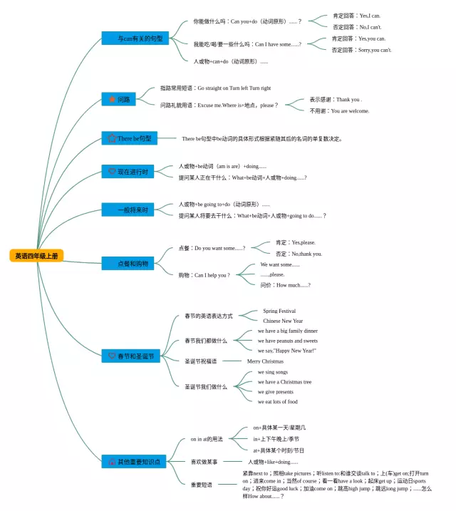 四年级下册思维导图合集,英语四年级思维导图下册,内容涵盖语音、词汇、句型、其他知识点等4个部分,24张附下载,每张思维导图都非常漂亮,每张图片均附下载。