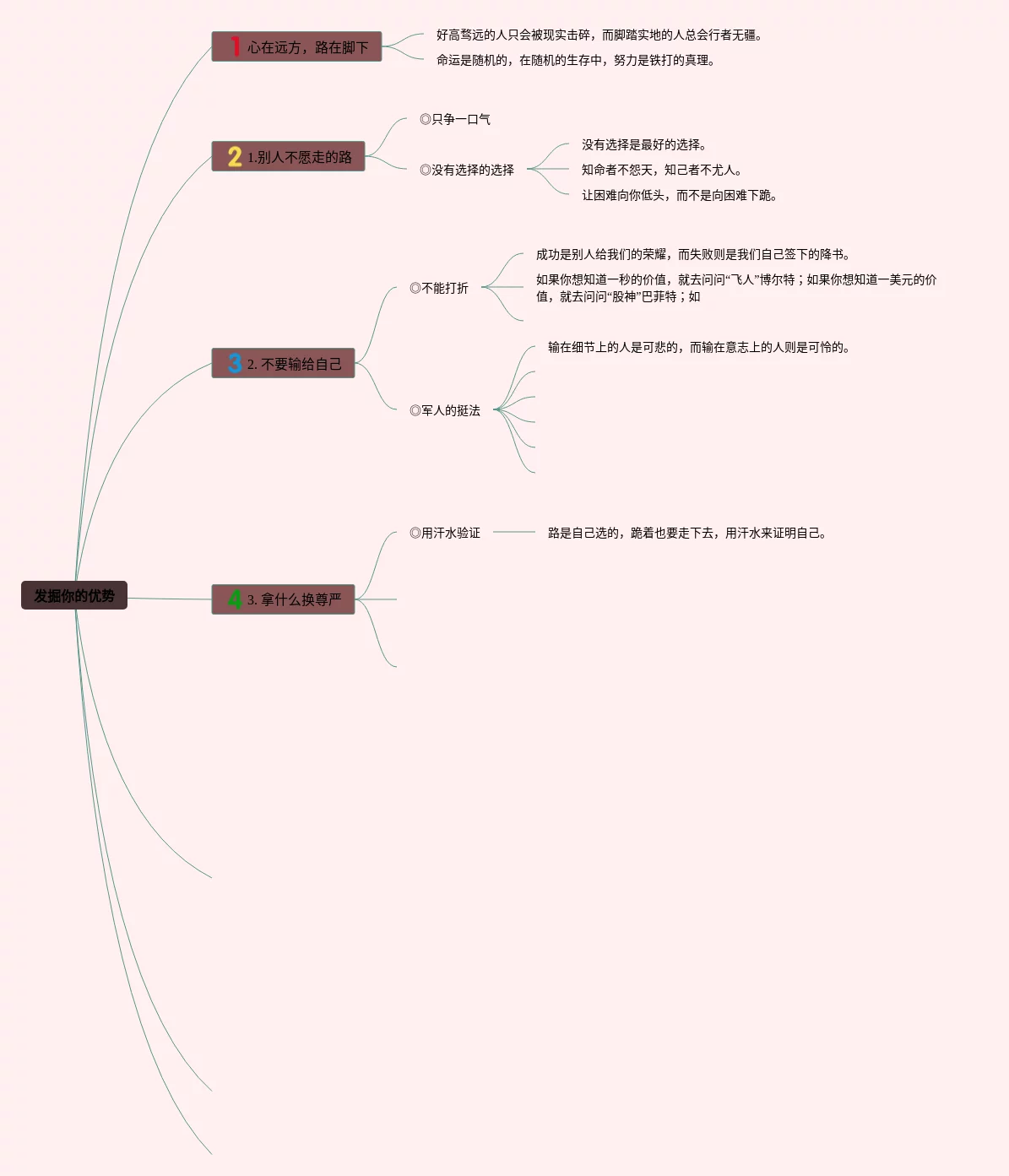 25张思维导图的优势包括合集,思维导图的优势包括,内容涵盖心在远方路在脚下、1.别人不愿走的路、2. 不要输给自己、3. 拿什么换尊严、4. 早一步卡位等7个部分,25张精选版,每张思维导图都非常简单,每张图片均精选版。